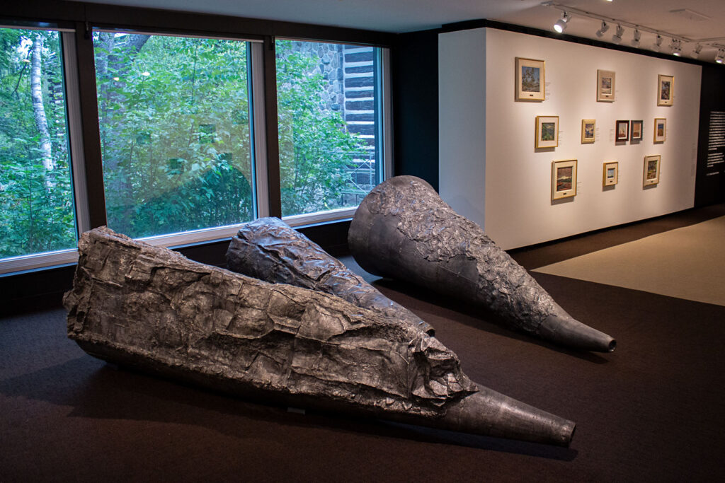 Commanding the centre of the gallery, however, rest some more recent jewels. Three of Rebecca Belmore’s “Wave Sound” sculptures, installed by a window, point out over the treetops of the Humber Valley. The metal listening horns are larger than dinosaur bones and cast from some of the same rocky terrain the Group depicted. They appear ancient, as if the gallery sprang up around them.