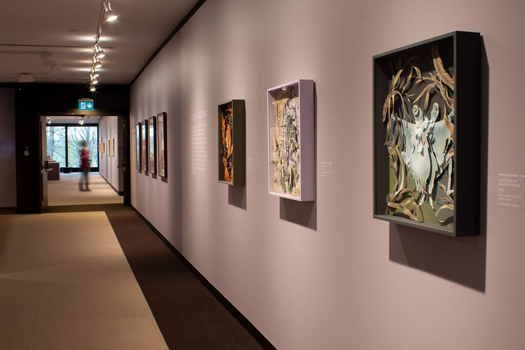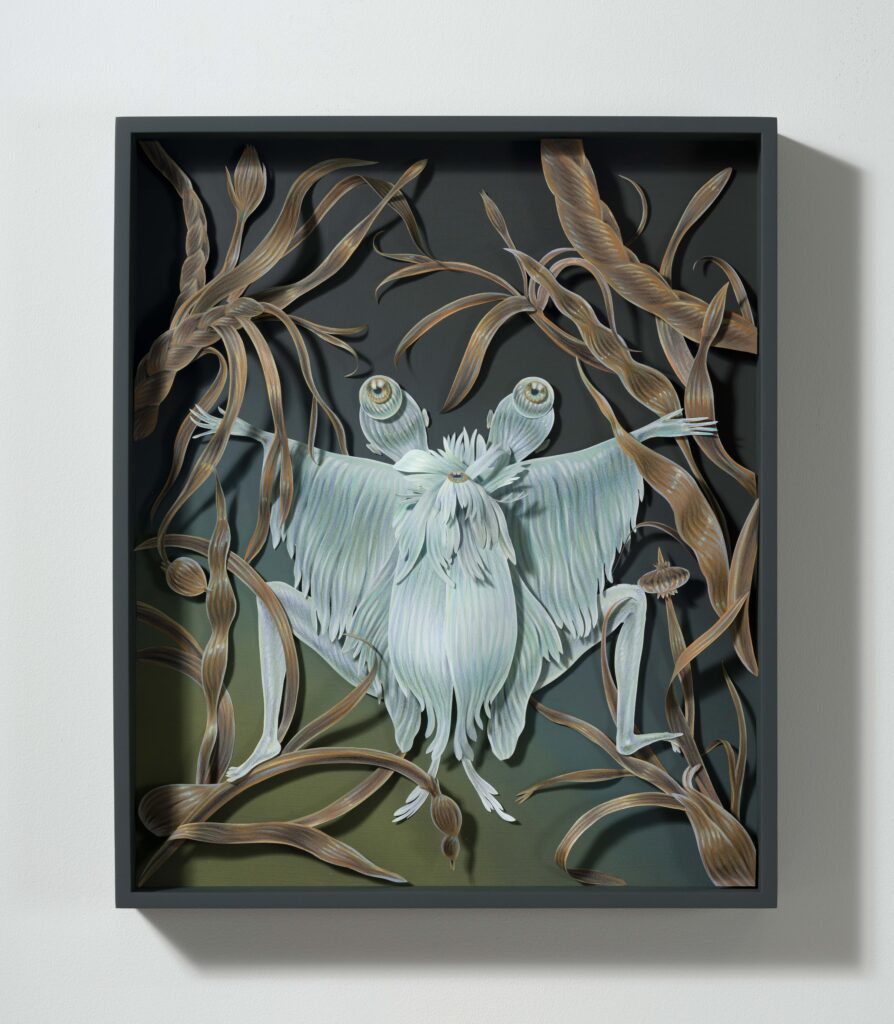 False Eyes of a Reliable Witness, one of Winnie Truong’s paper-cut collages from the 2022 series Herbaria, depicts a spread-eagled moth-like figure with bulging eyeballs staring out from the backs of its two heads. The creature balances delicately on browning grasses woven into Rapunzel-esque braids. Most of the bodies in this exhibition are feminized, correlating with the gender commonly assigned to planet Earth.