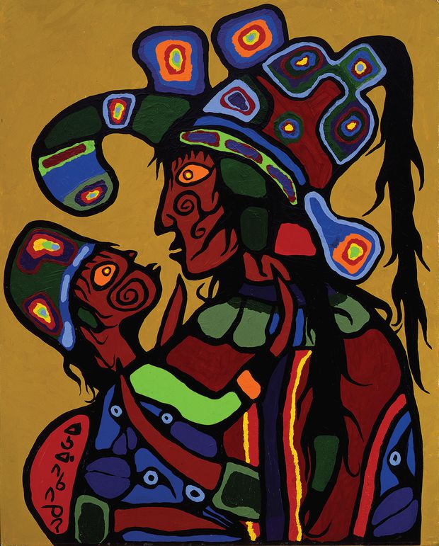 The room of this work, dating to the 1960s and 1970s, is actually one of the few dull moments in the exhibition: There is a hesitancy and flatness still as Morrisseau and his contemporaries begin to fashion a hybrid of Indigenous themes and settler media, launching the Woodland School. To recall how Morrisseau successfully invented a new iconography, visibly Indigenous, wholly contemporary and uniquely his own, you need to persist a bit further, to a room devoted to his larger works. It includes a fabulous self-portrait as a shaman alongside a depiction of his wife and child, as Morrisseau blows open both Christian iconography and the Western tradition of companion portraits of bourgeois couples.