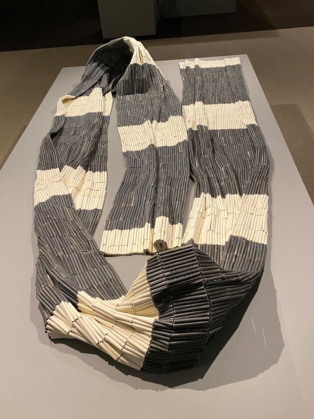 Here you see the beginnings of what has become, in the past 20 years, the most exciting development in Canadian art: the emergence of a contemporary art practice that is both completely cognizant of international trends yet powerfully rooted in Indigenous experience, history and materials. The show includes a gigantic reproduction of a wampum belt fashioned from clay beads by Montreal artist Nadia Myre, whose medium was inspired by the clay pipes that European settlers brought to North America. Referring to the beaded belts that represent a contract between nations (a few historical examples of the real thing are displayed nearby), the piece is filled with the fraught history of contact, yet also works as an impressive modernist sculpture draped on a low plinth. Next to it is a black curtain of Tyvek housing insulation created by Caroline Monnet, again both a reference to a mournful history (and the half-built houses on reserves) as well as a powerful statement in abstract form.