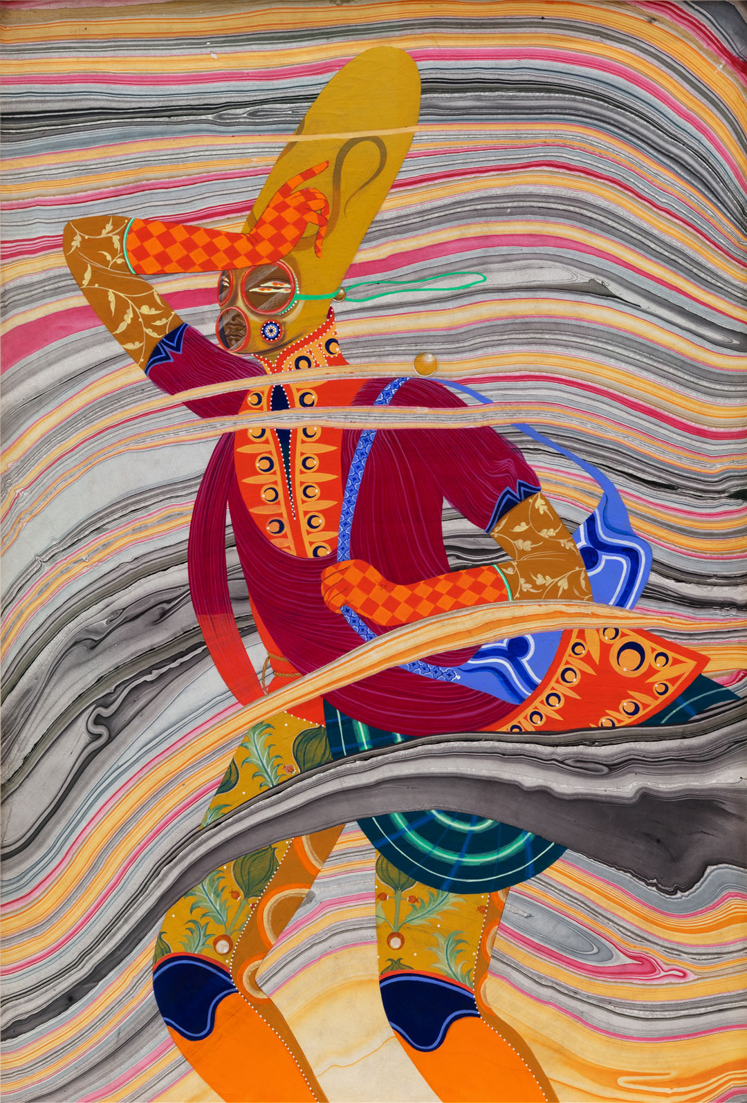 Perera’s style, with flat expanses of saturated colours, echoes the Mughal painting tradition that was at its height in the 17th and 18th centuries and, although she paints fast, her images are always impressively detailed. The marble paper she uses as her background Storm and Flood appears in spots to overlap the figures, an illusion created when she carefully stops painting their costumes in certain areas.