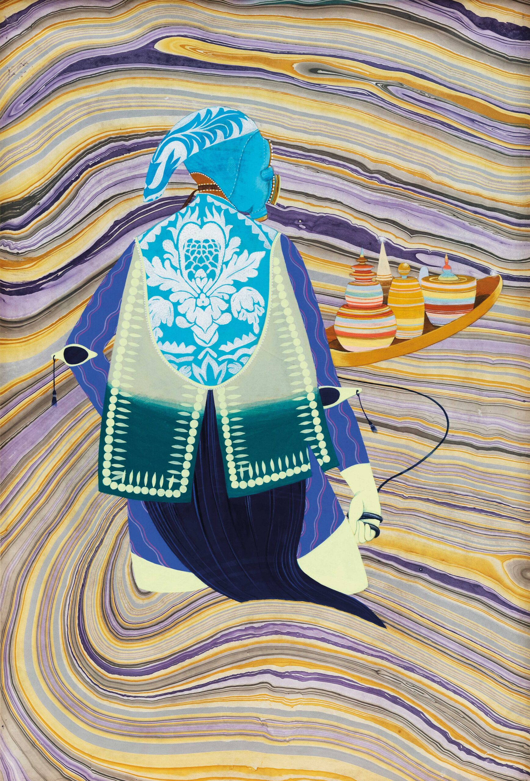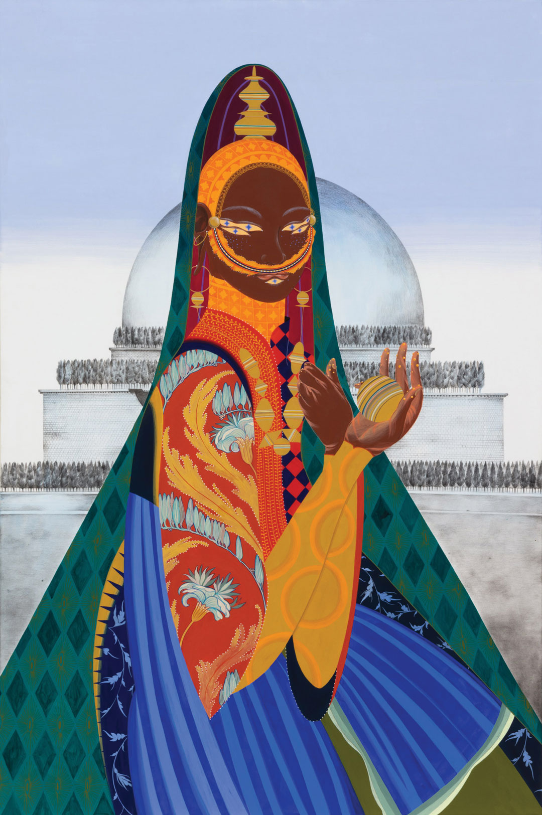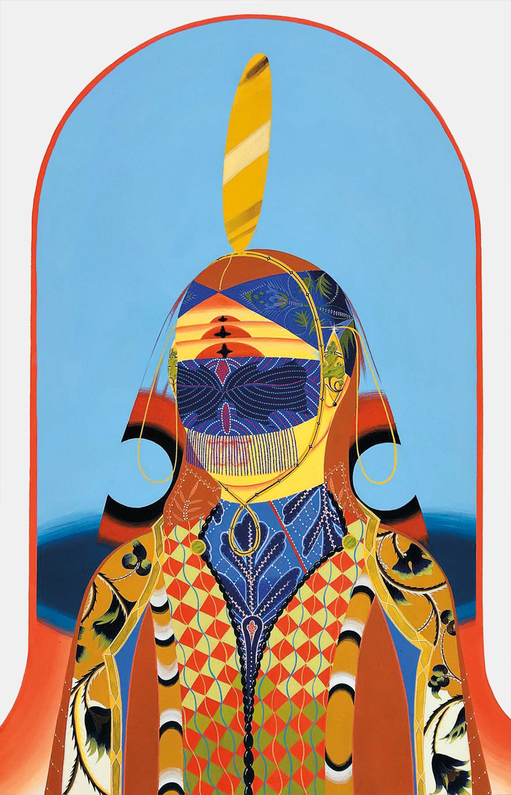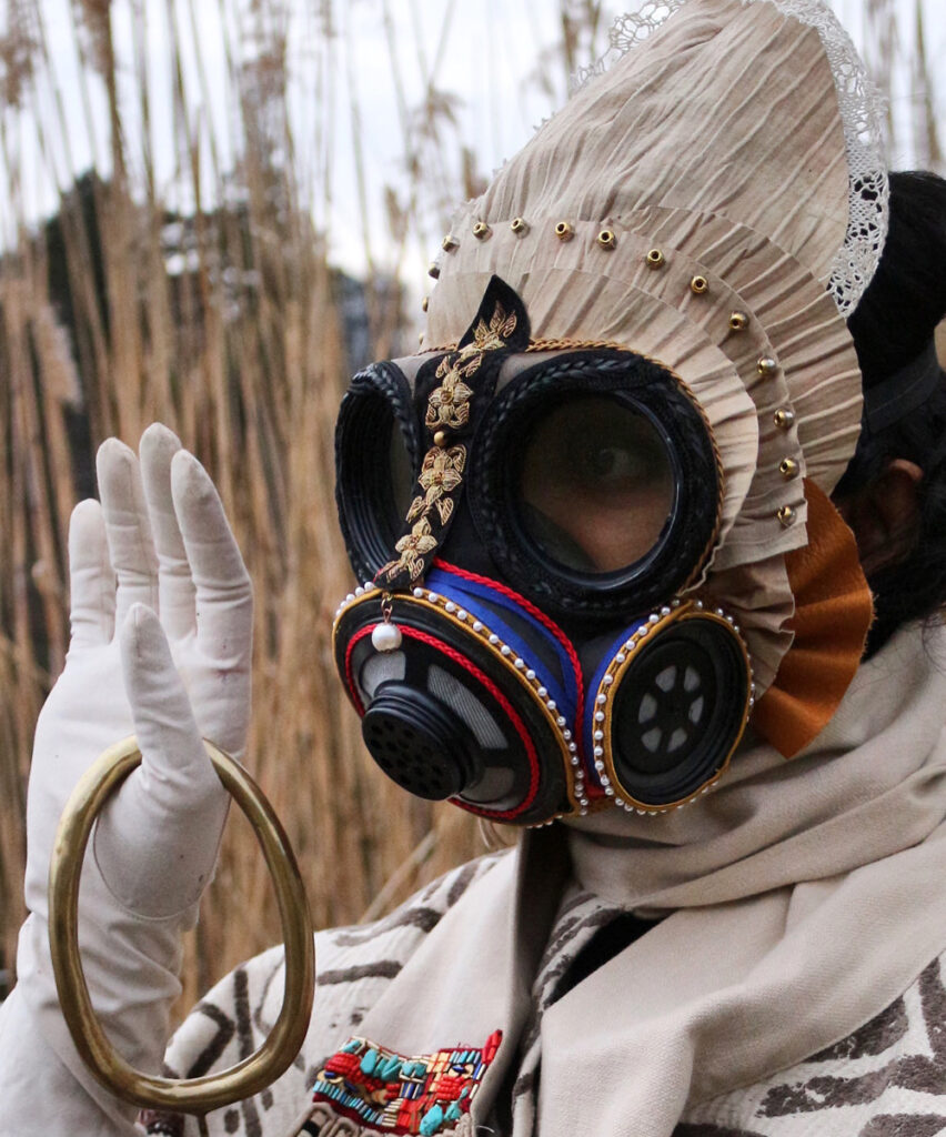It’s Milroy who approached Perera about doing an exhibition at the McMichael, and the show has been designed to go on the road. After closing in May, it’s expected to appear at three more museums in Ontario (Carleton University Art Gallery, Art Windsor-Essex and McMaster University Art Gallery). The exhibition largely pulls from the artist’s Traveller series, a body of work that includes paintings, textiles, photographs and “pollution wear” masks. Like so much of what Perera creates, Traveller is set in a sci-fi universe, and like other strong examples of the genre, its imaginary world isn’t so different from our own.