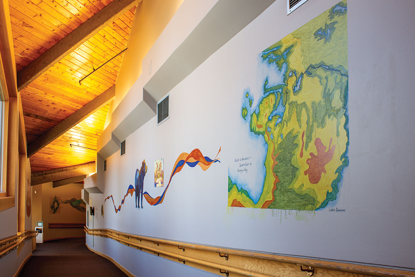 Initially, Devine says, she thought the story of the mural “would revolve around John Graves Simcoe, the Toronto Purchase, the Mississaugas of the Credit — that kind of history.” But part of Devine’s research for the mural included visiting the Seed-Barker archaeological site in Kleinburg, which Devine learned had been the location of a Wendat settlement around 500 years ago. “I realized that the story that I wanted to tell about the Humber River and about the trail up the Humber River was older than 200 years,” says Devine. “It was a Wendat story.”
