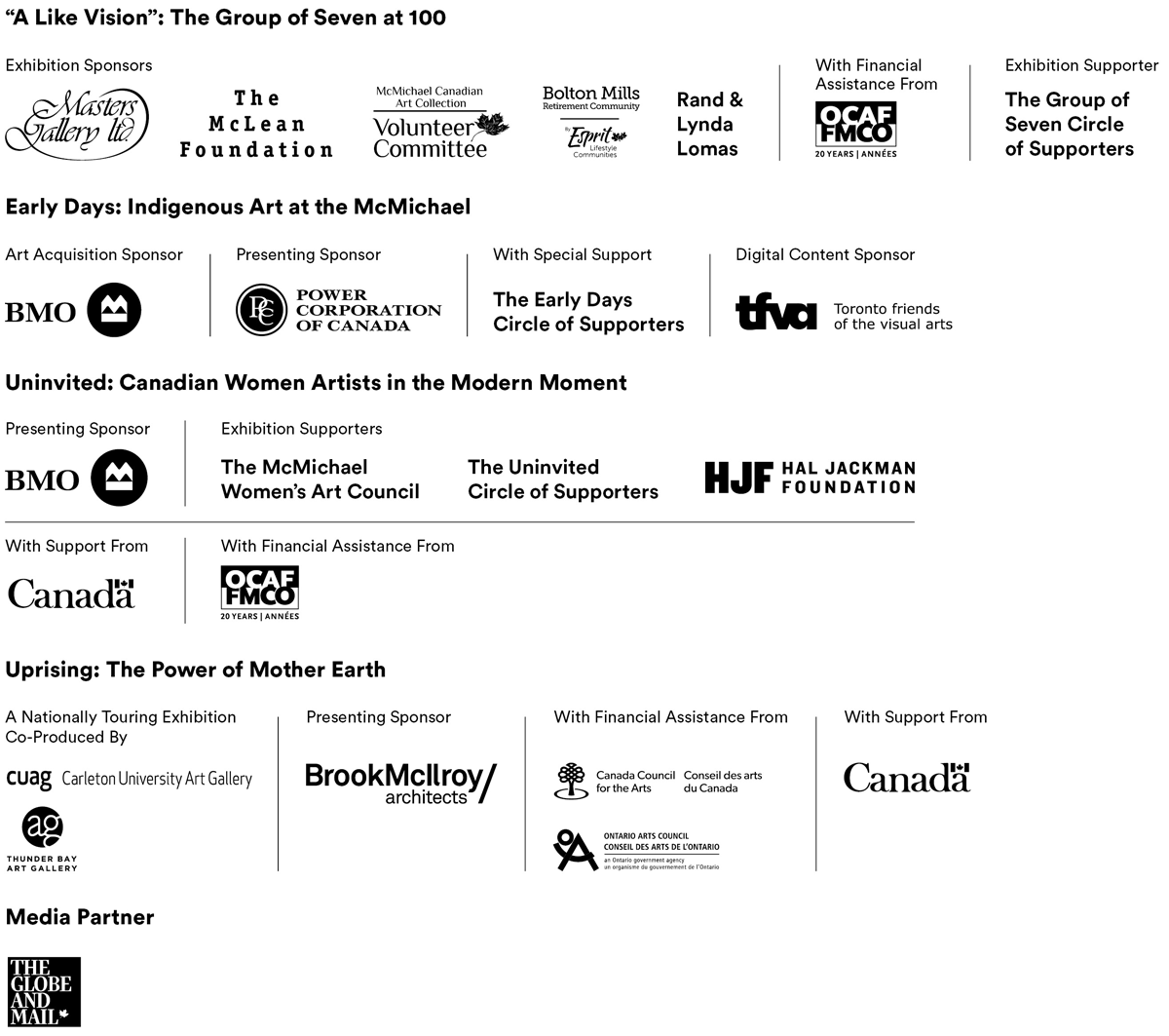 Please note that the McMichael Canadian Art Collection is closed until further notice while York Region is in lockdown. The McMichael’s grounds and trails remain open but are not being maintained while the Gallery is closed. Media wishing to request an interview with exhibition artists, curators, Chief Curator Sarah Milroy or to obtain high-resolution images of the artworks are requested to contact Sam Cheung at scheung@mcmichael2.wpengine.com or 905.893.1121 ext. 2210.