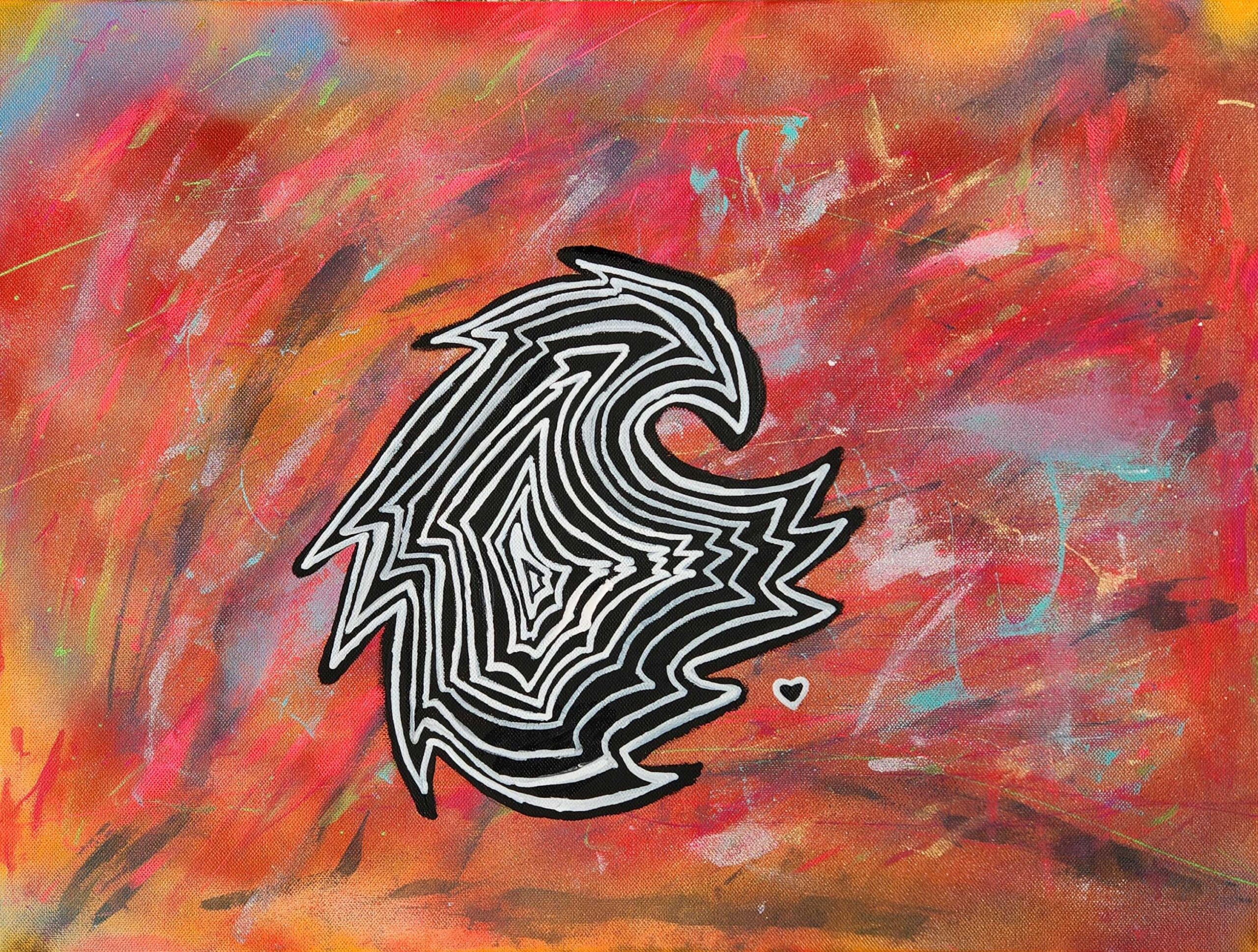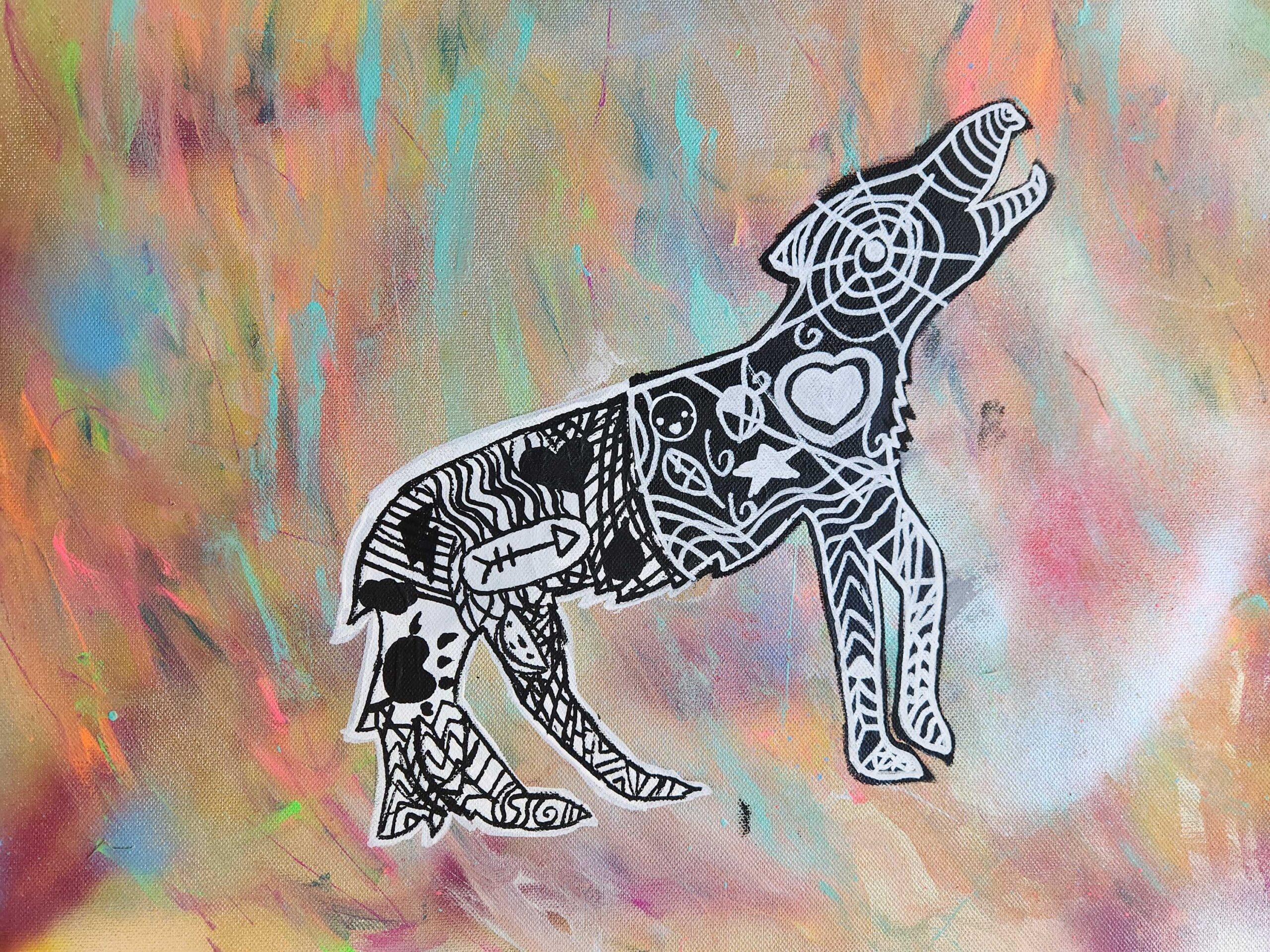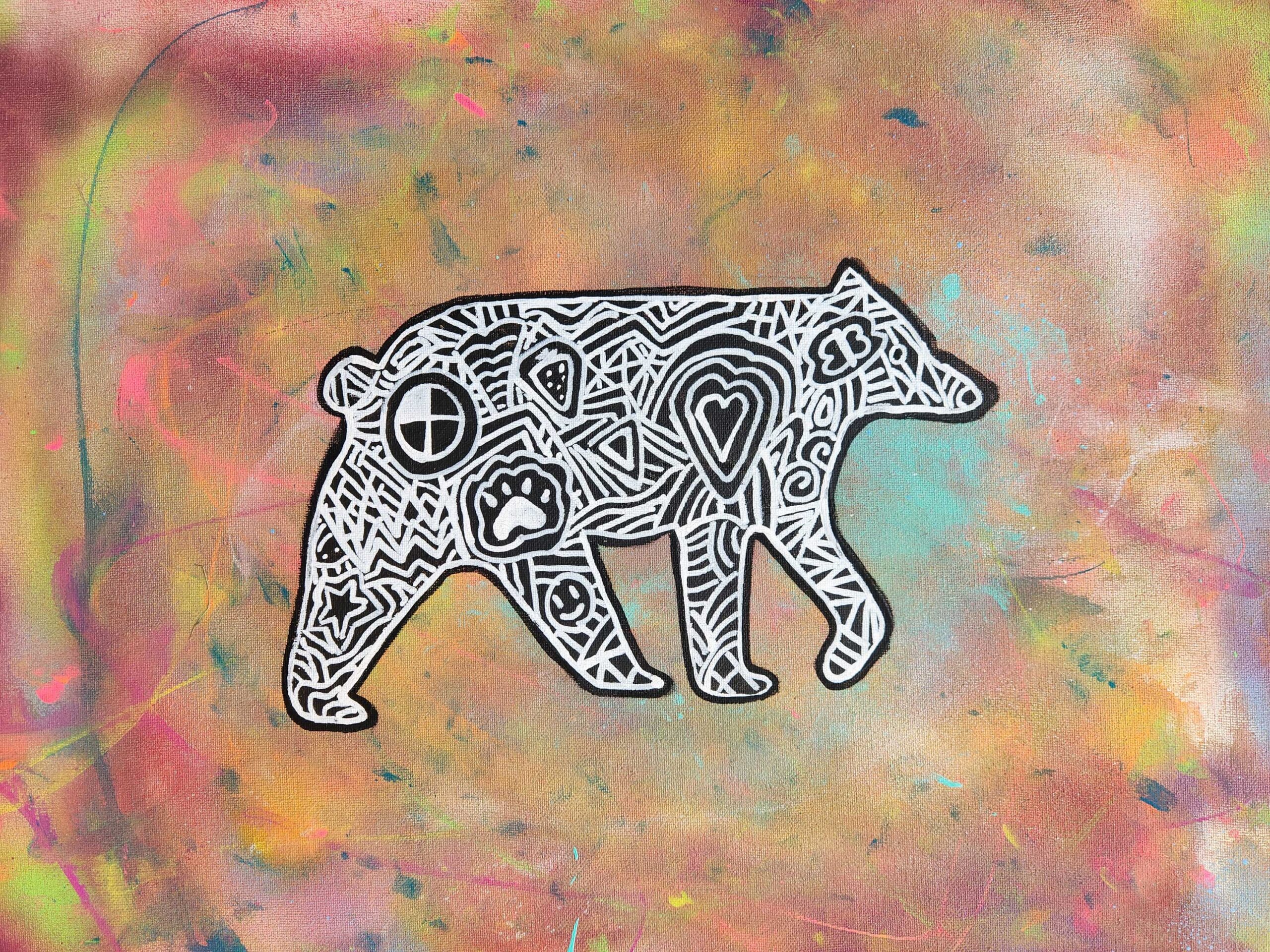 I chose the bear because it reminds me of bravery, humility, and respect. The symbols in my art piece represent the mind and thinking in general. In our heads, we can remember fondly, but we can also forget along the way in life and I feel the art piece shows all the good memories and stories we people share. I used spray paint, paint, sharpie markers, and creativity. I used lots of lines and overlapping shapes mixed with some neutral colors and rough sharp shapes to bring out the elements of the mind.