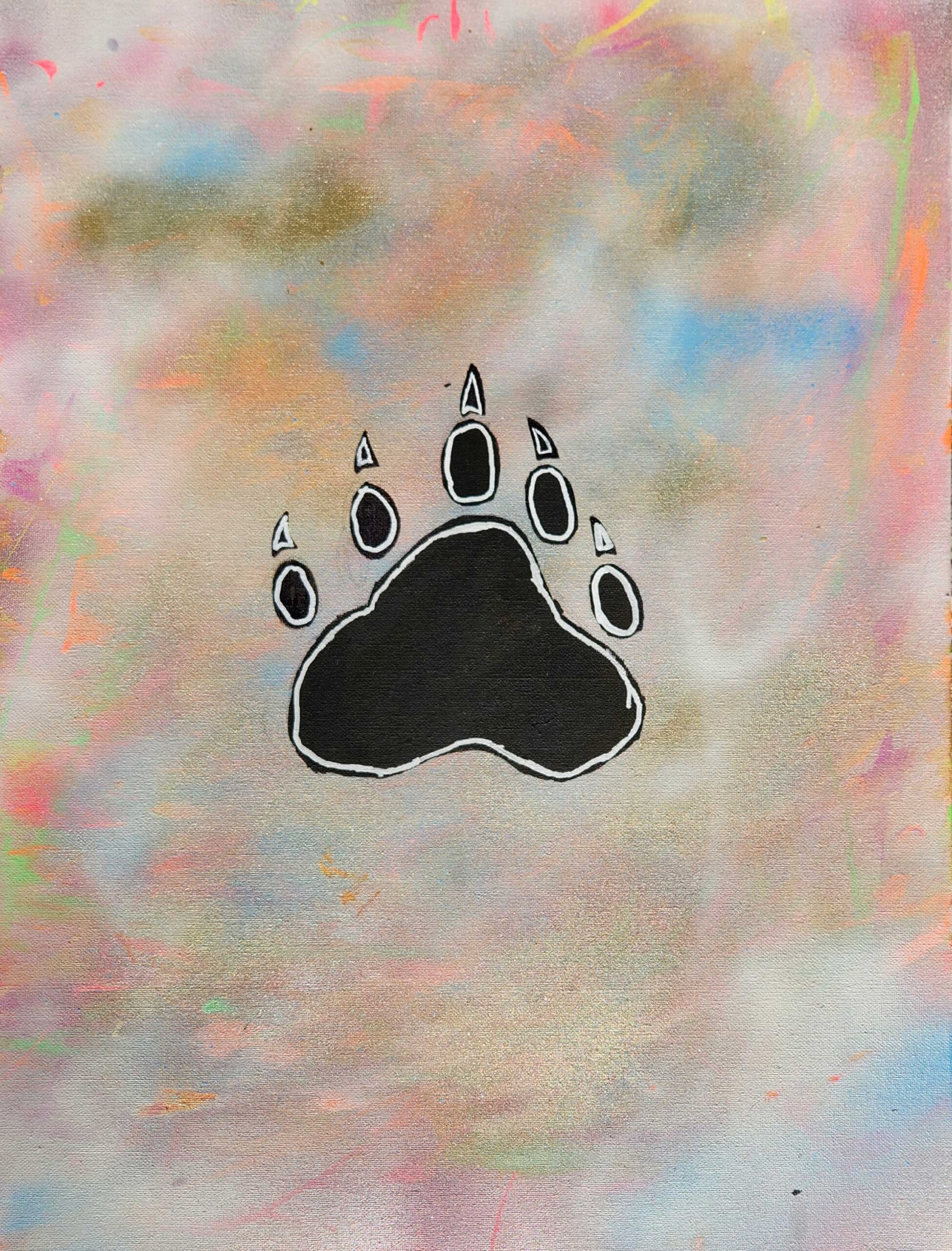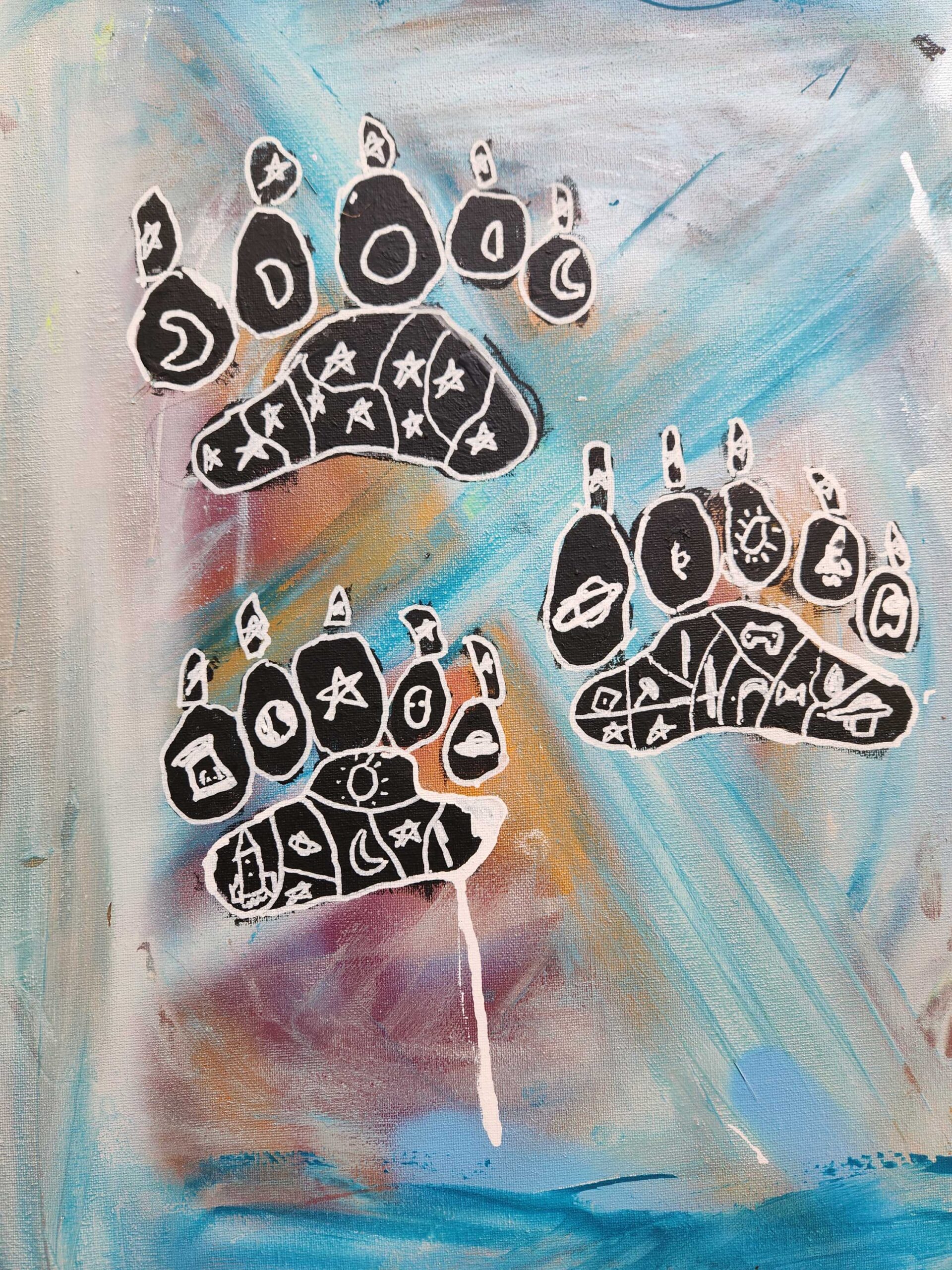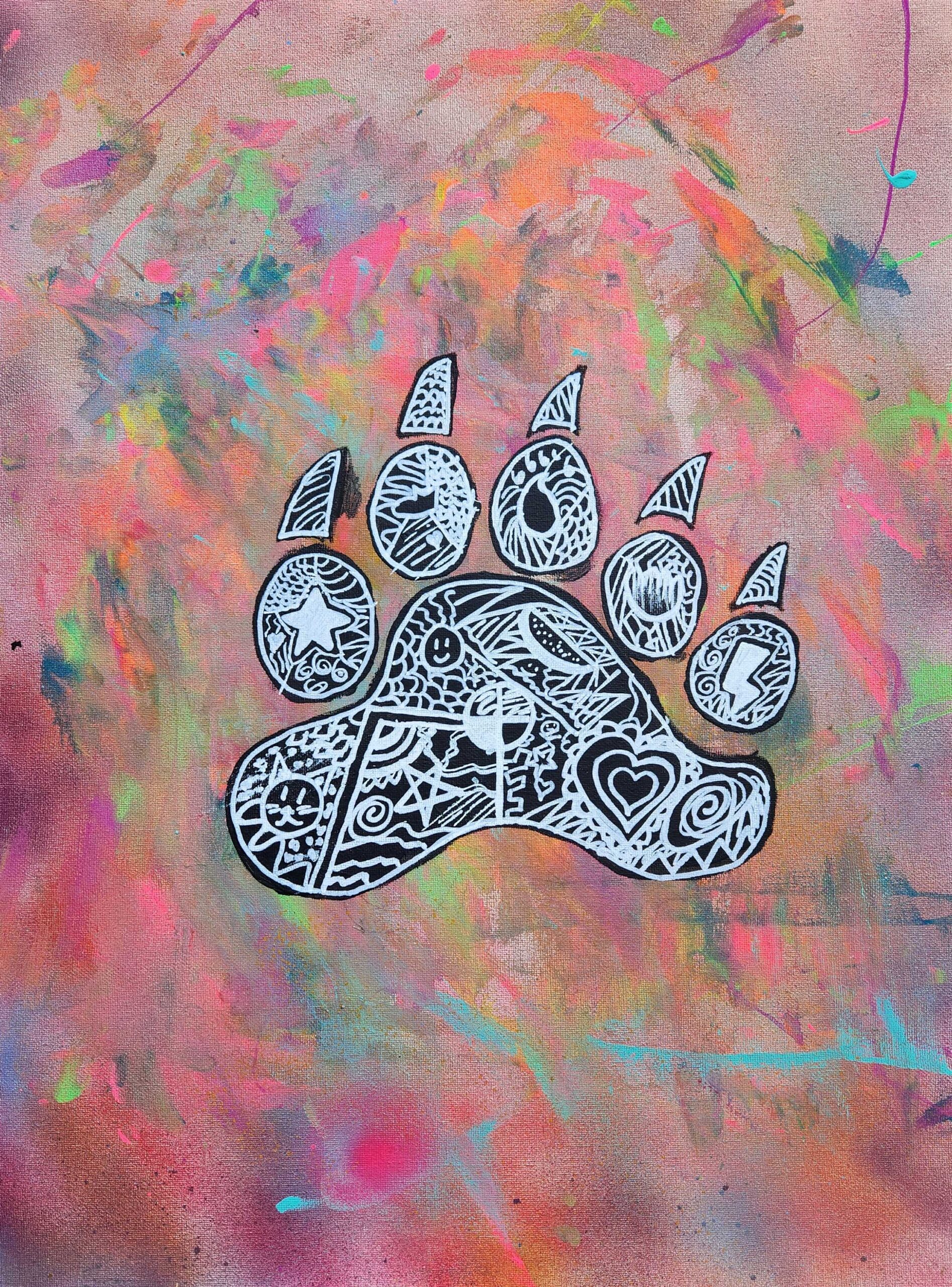 The thing I chose to represent me was a bear paw. I chose a bear paw because honestly, I just chose the easiest one. But aside from that I just feel like I wouldnt be able to represent an actual animal, so that was just another reason why I went for the paw of a bear. The symbols in my art piece represent the indigenous people like how I put The medicine wheel and other stuff layla said I should put. The materials I used to create this art piece were spray paint, paint, pencil and black & white Sharpie paint markers. The elements of art I used in my painting were line, colour and shape.