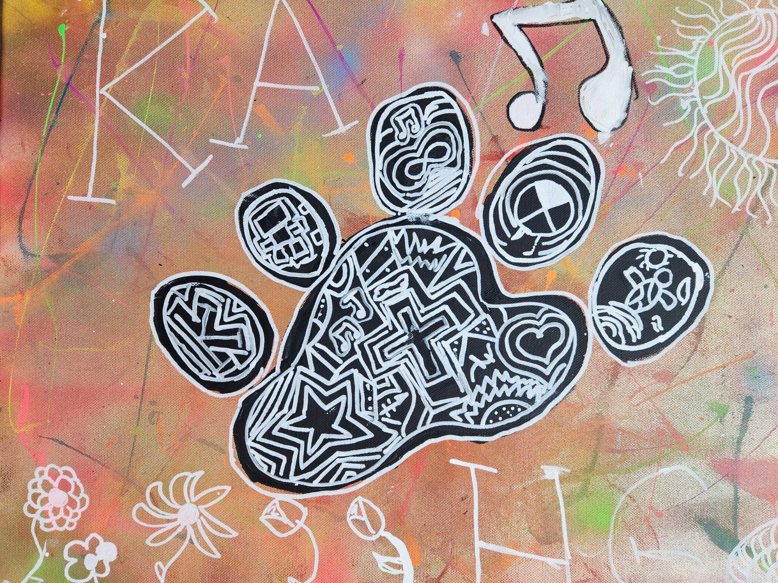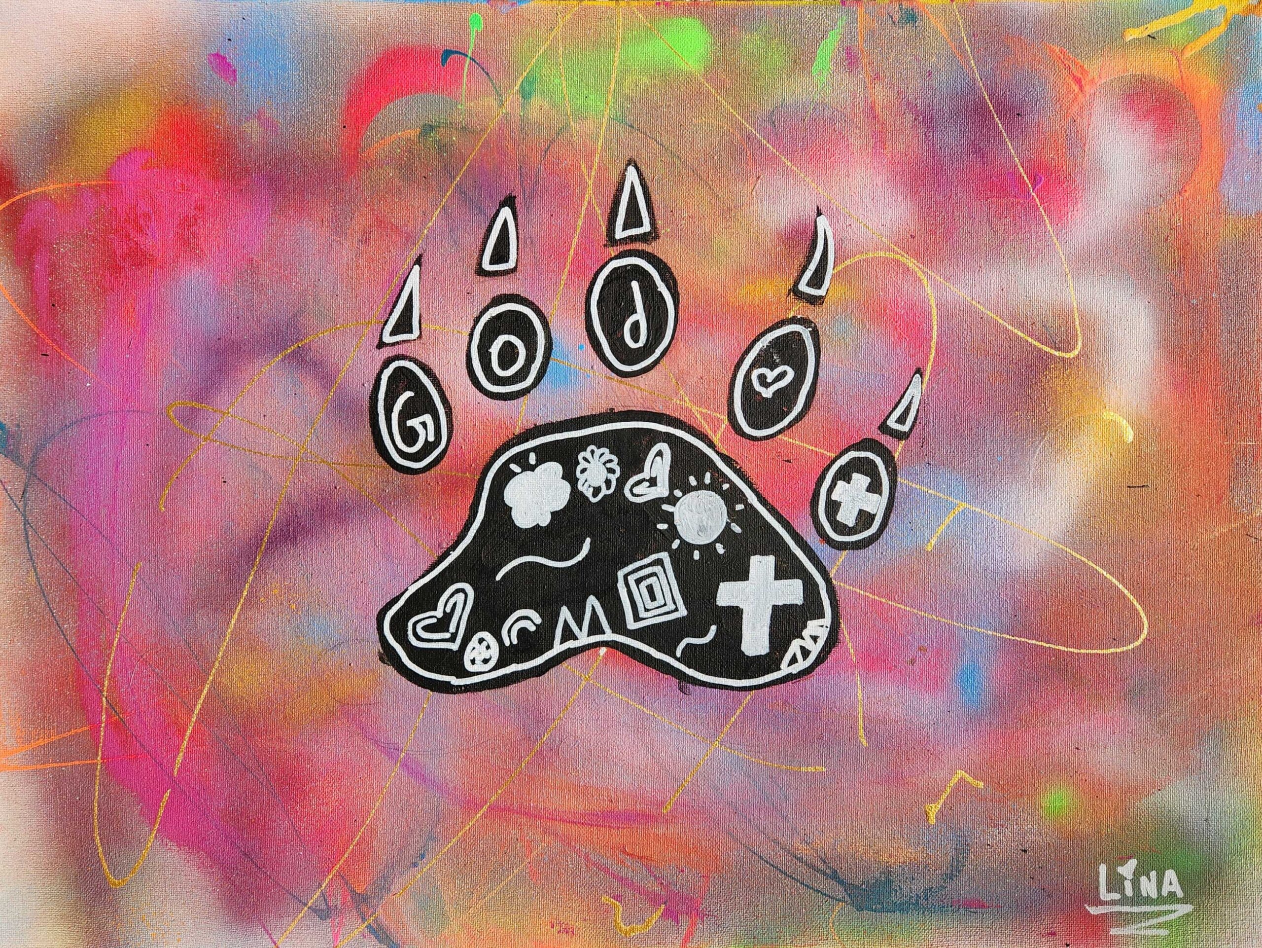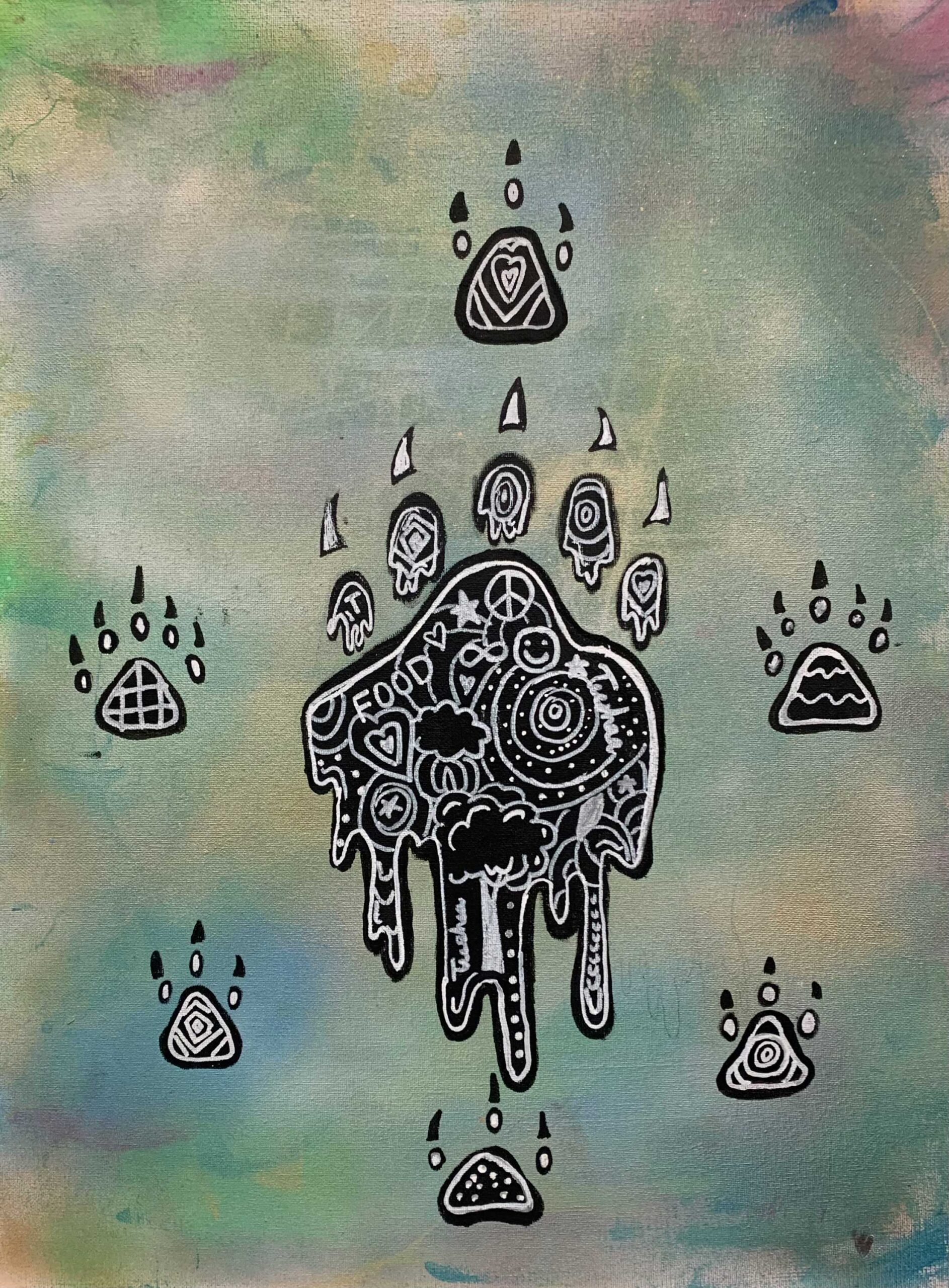 The thing I chose to represent me was a bear paw. I chose a bear paw because honestly, I just chose the easiest one. But aside from that I just feel like I wouldnt be able to represent an actual animal, so that was just another reason why I went for the paw of a bear. The symbols in my art piece represent the indigenous people like how I put The medicine wheel and other stuff layla said I should put. The materials I used to create this art piece were spray paint, paint, pencil and black & white Sharpie paint markers. The elements of art I used in my painting were line, colour and shape.