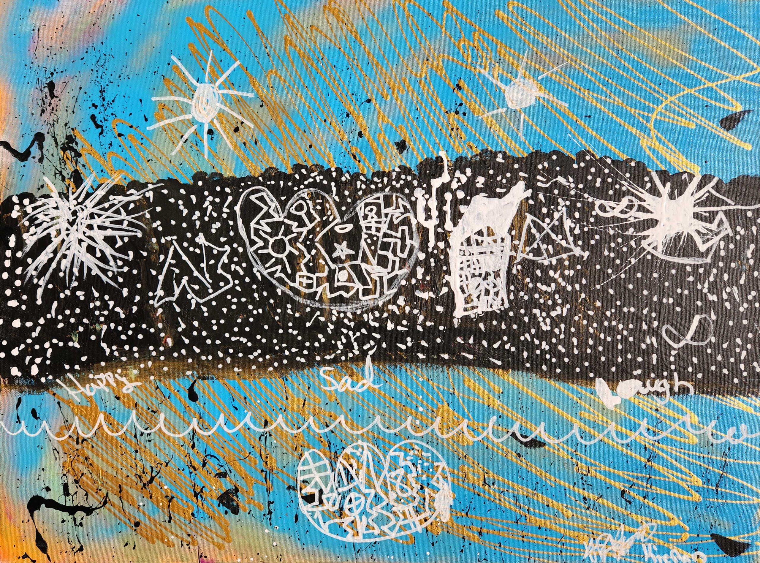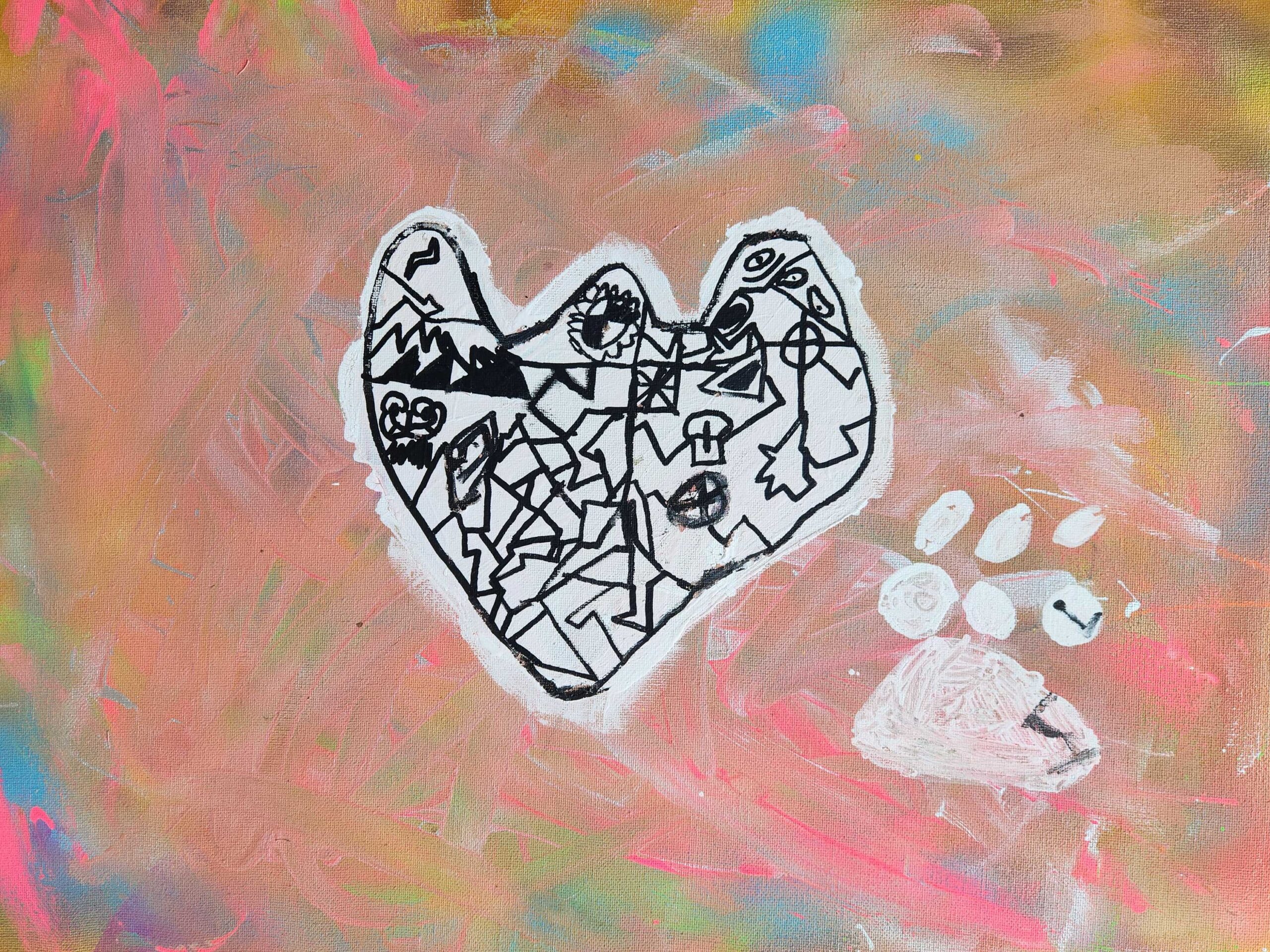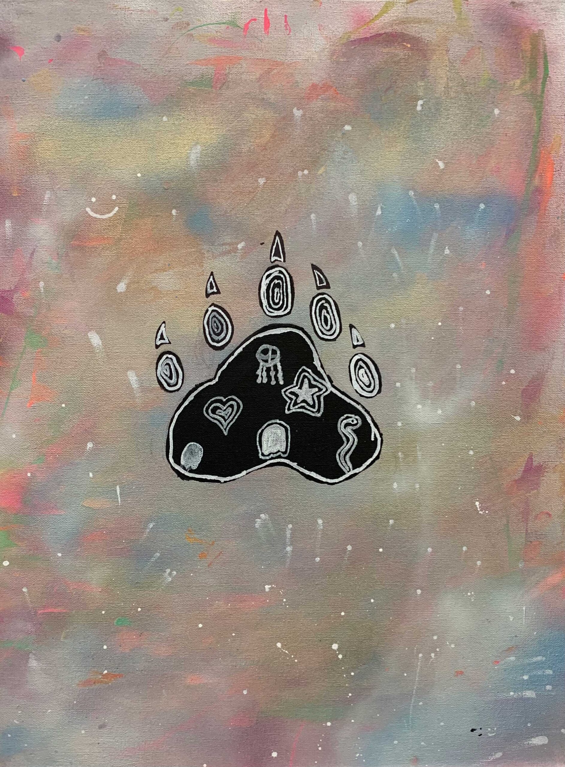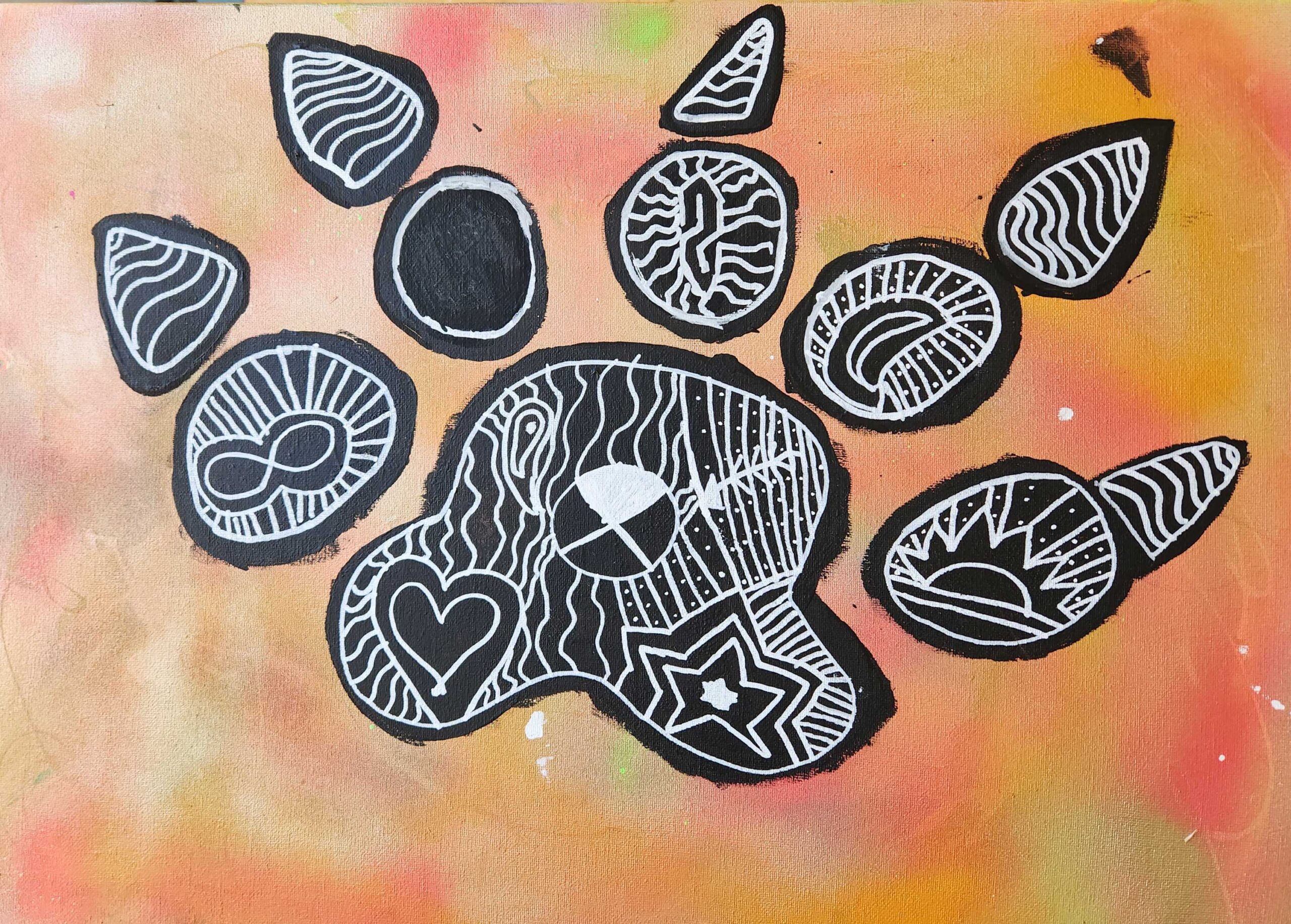 The animal I chose was the bear print. I chose the bear print because I like to explore new things. The symbols I chose was a heart, a star, a sun. The elements of art I used in my painting were line, colour and shape.