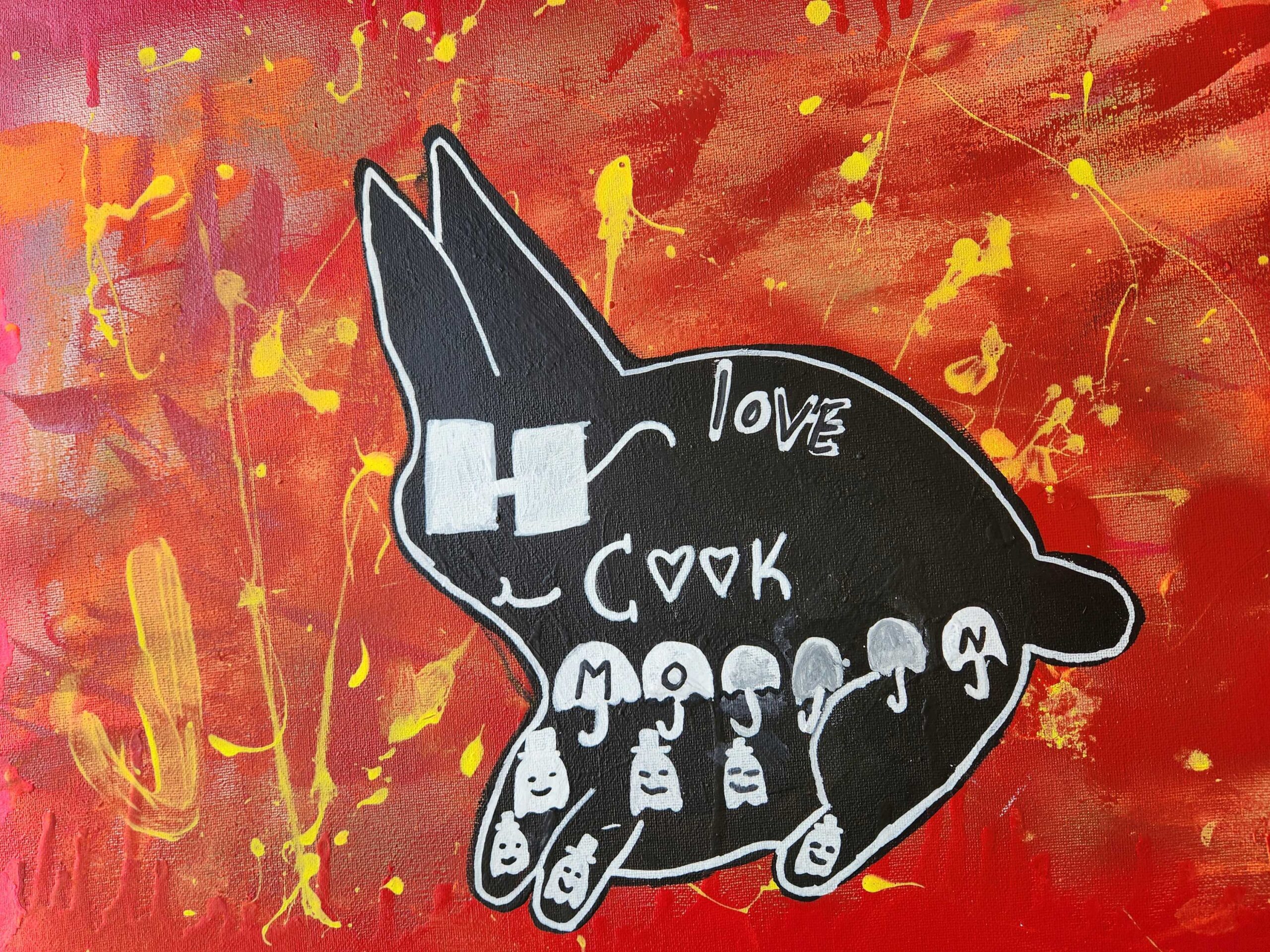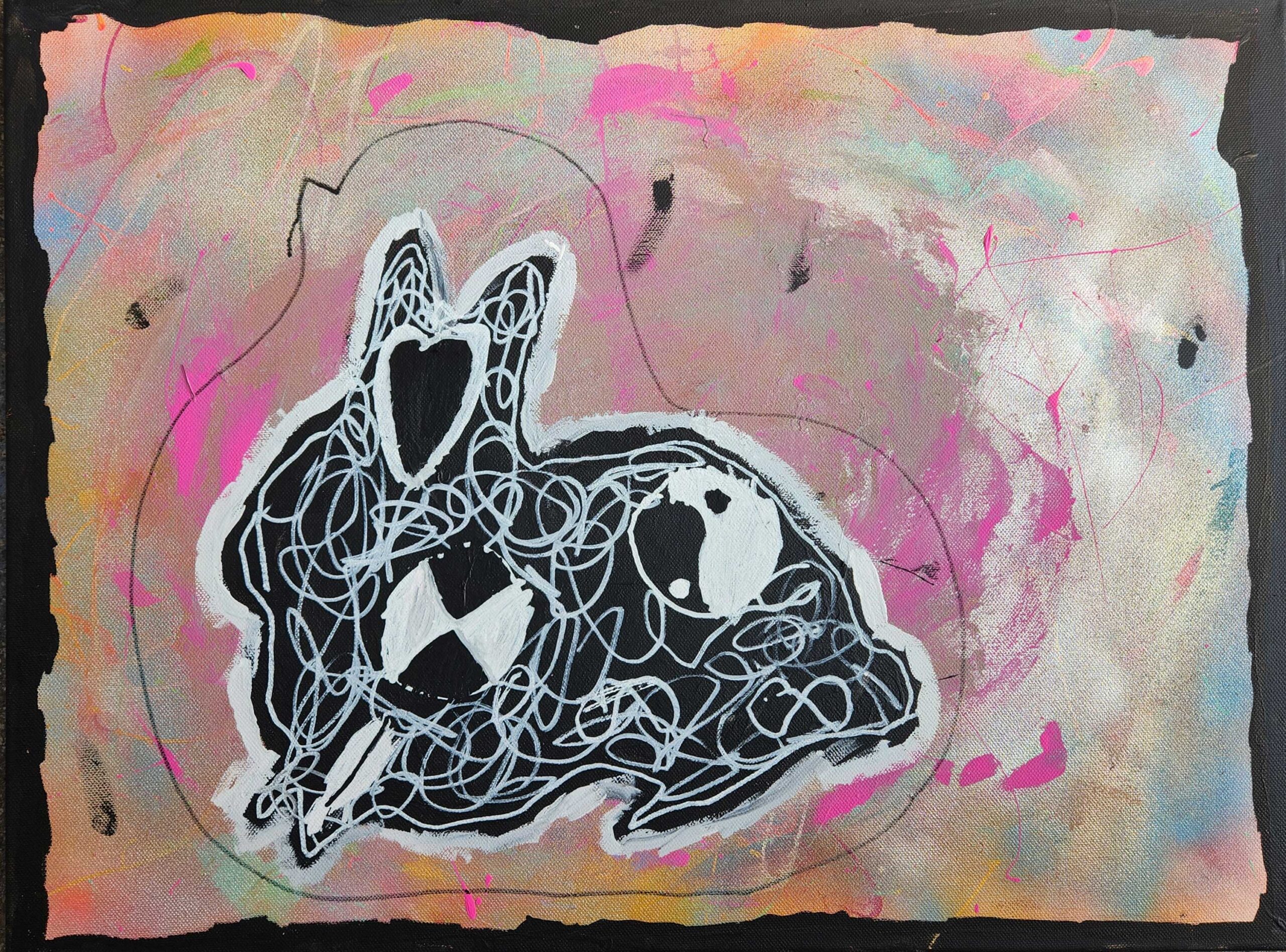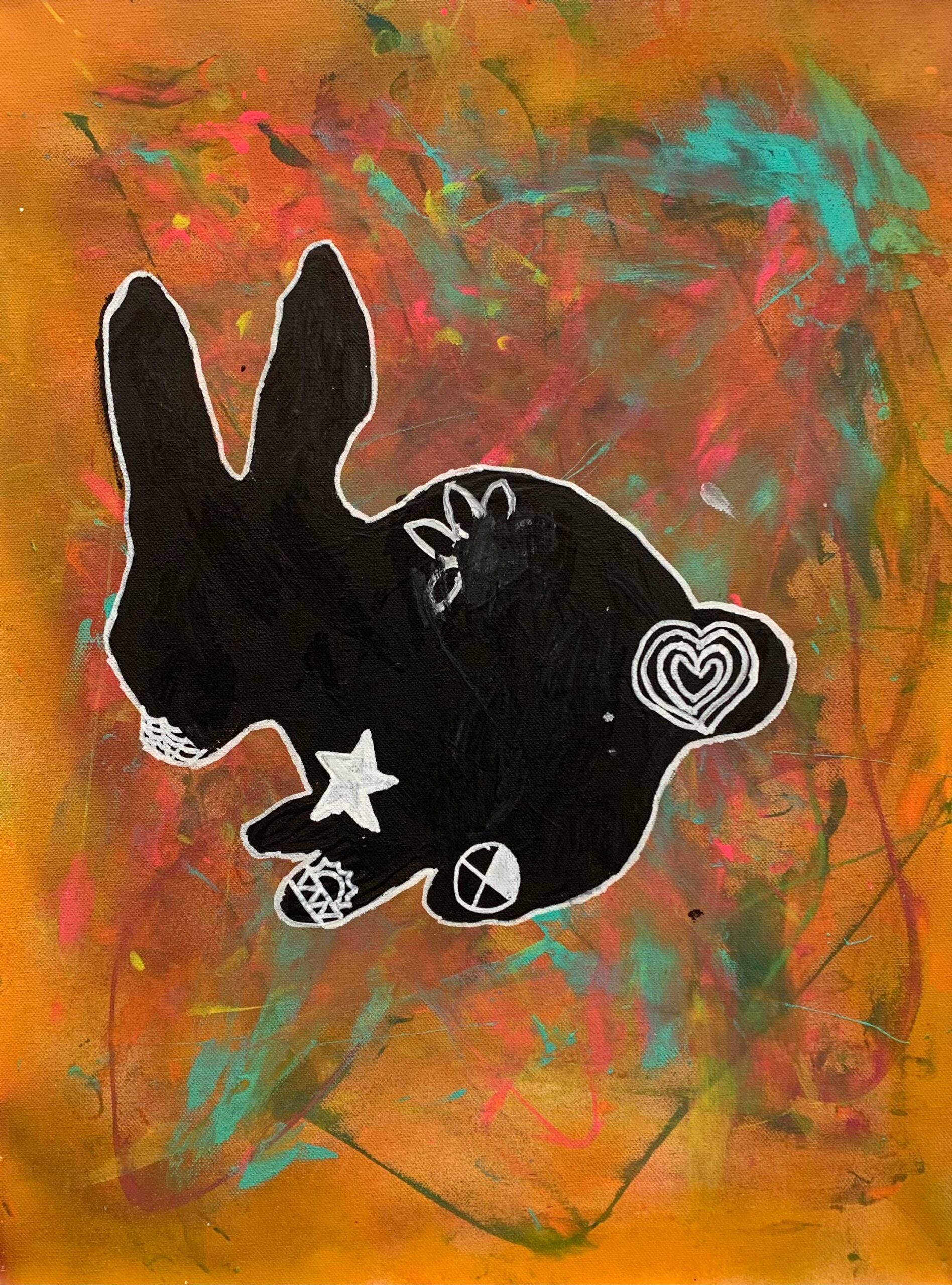 The animal I chose to represent me was a rabbit.I chose a rabbit because they are my favorite animal. They are cute, cuddly and fluffy. And they make me happy when I see them. I have only seen one in person and they are very adorable. I didn’t put any symbols that represent me because I didn’t know what to put that represented me. But the other symbols that i used where hearts. The materials I used were spray paint, paint, pencil, sharpie paint markers.