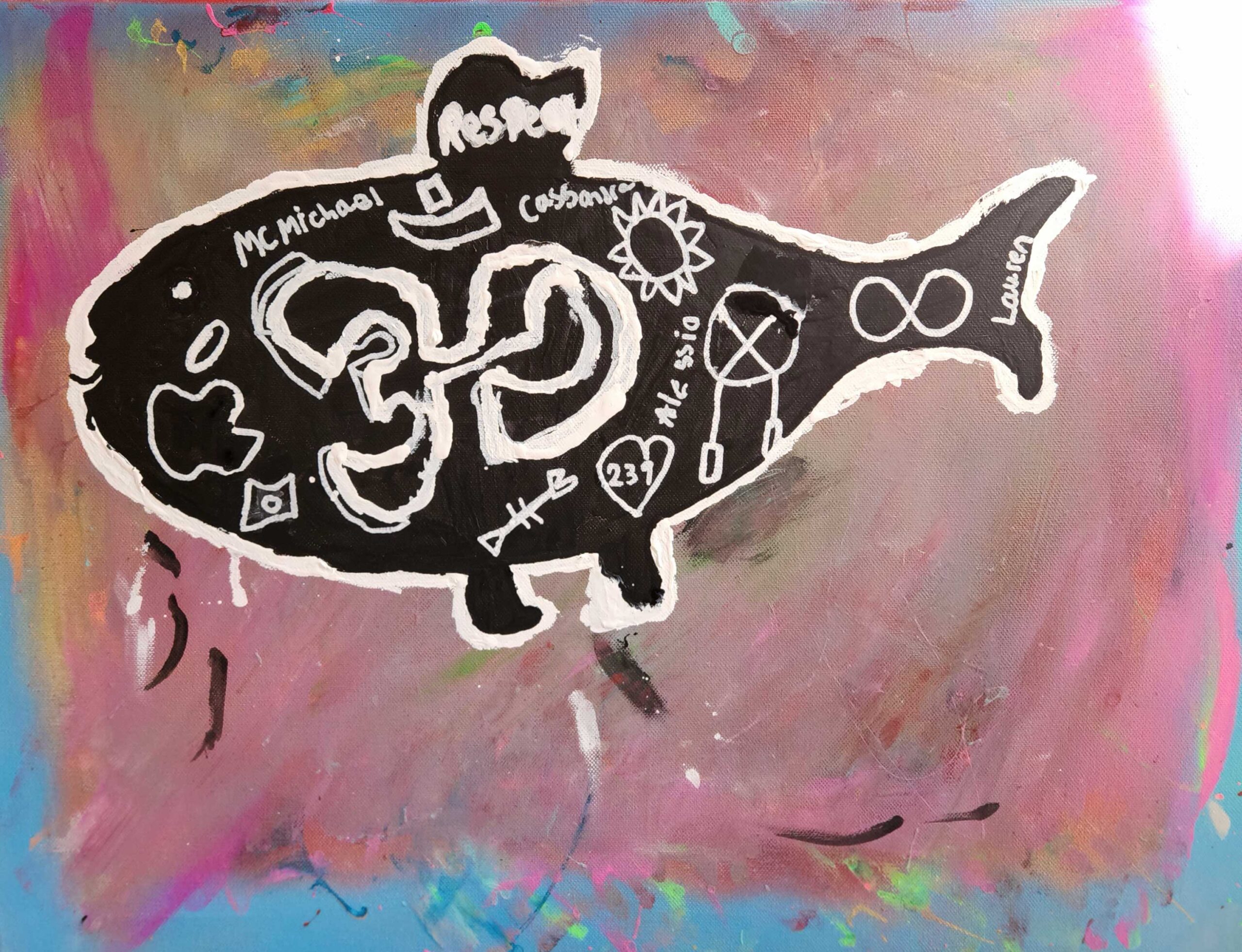 I chose a bear because me and my family are bear clan. Because I love bears and I think bears are cute and they are so unique. That is why I chose the bear. I chose a bear paw because I’m bear clan. I chose a medicine wheel because I’m First Nation. I put a hart because I’m lovely and I put in a star because I wanted to. Pencils, white markers, black markers, paint, Spray paint, and Sharpie. I used line Shapes and colors.