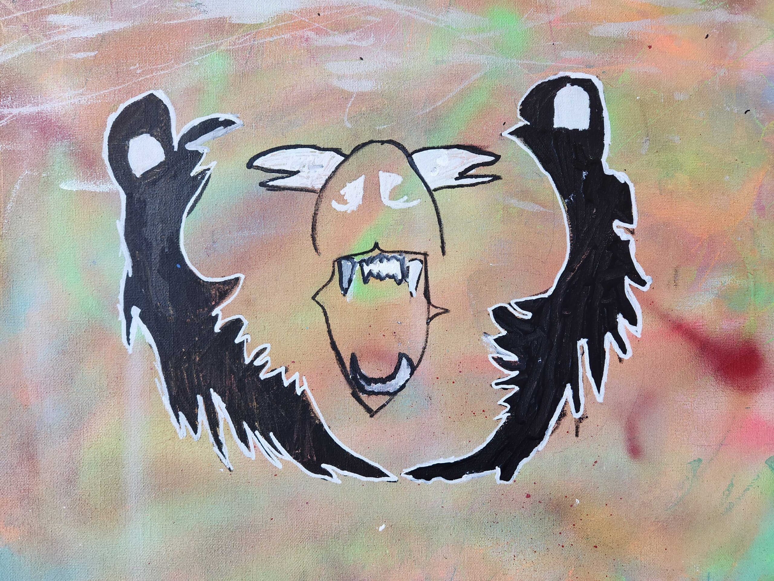 The animal I chose to represent me was a Bear. I chose a bear because I have a connection to the ones that come to the ones Because I’m very outside and love nature. The bears are a amazing animal in nature. They are Smart and aggressive. The materials I used to create this art piece were spray paint, paint, pencil and Sharpie paint markers. The elements of art I used in my painting were line, colour and shape.