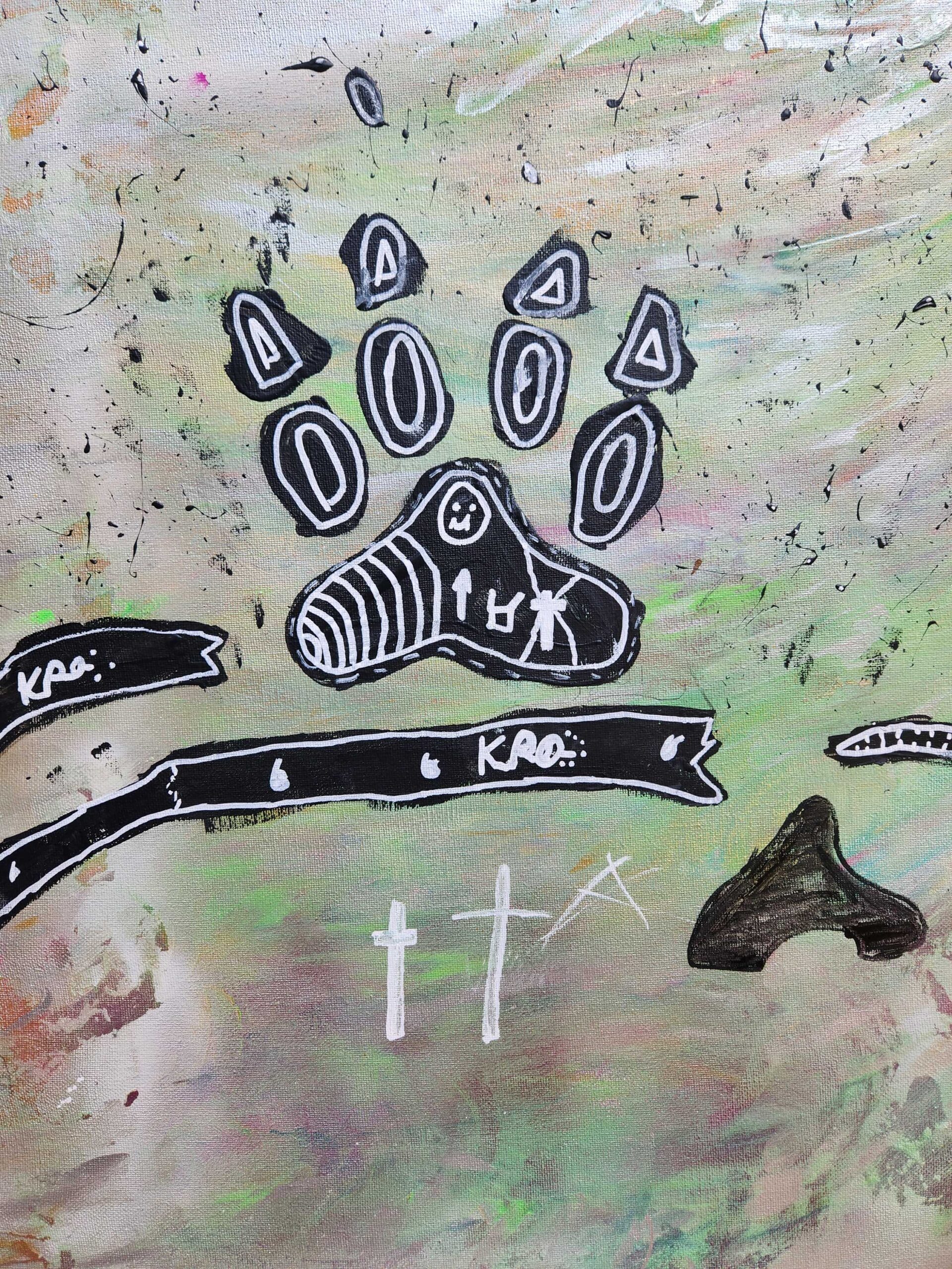 The Thing I chose to represent me was a paw. I chose a Paw because Dogs are my Favourite Animal. Some of the symbol I chose that represented me are Crosses Because I am christian I put a arrow because it’s Pointing To Heaven. The materials I used to create this art piece were spray paint, paint, pencil and Sharpie paint markers. The elements of art I used in my painting were line, colour and shape.
