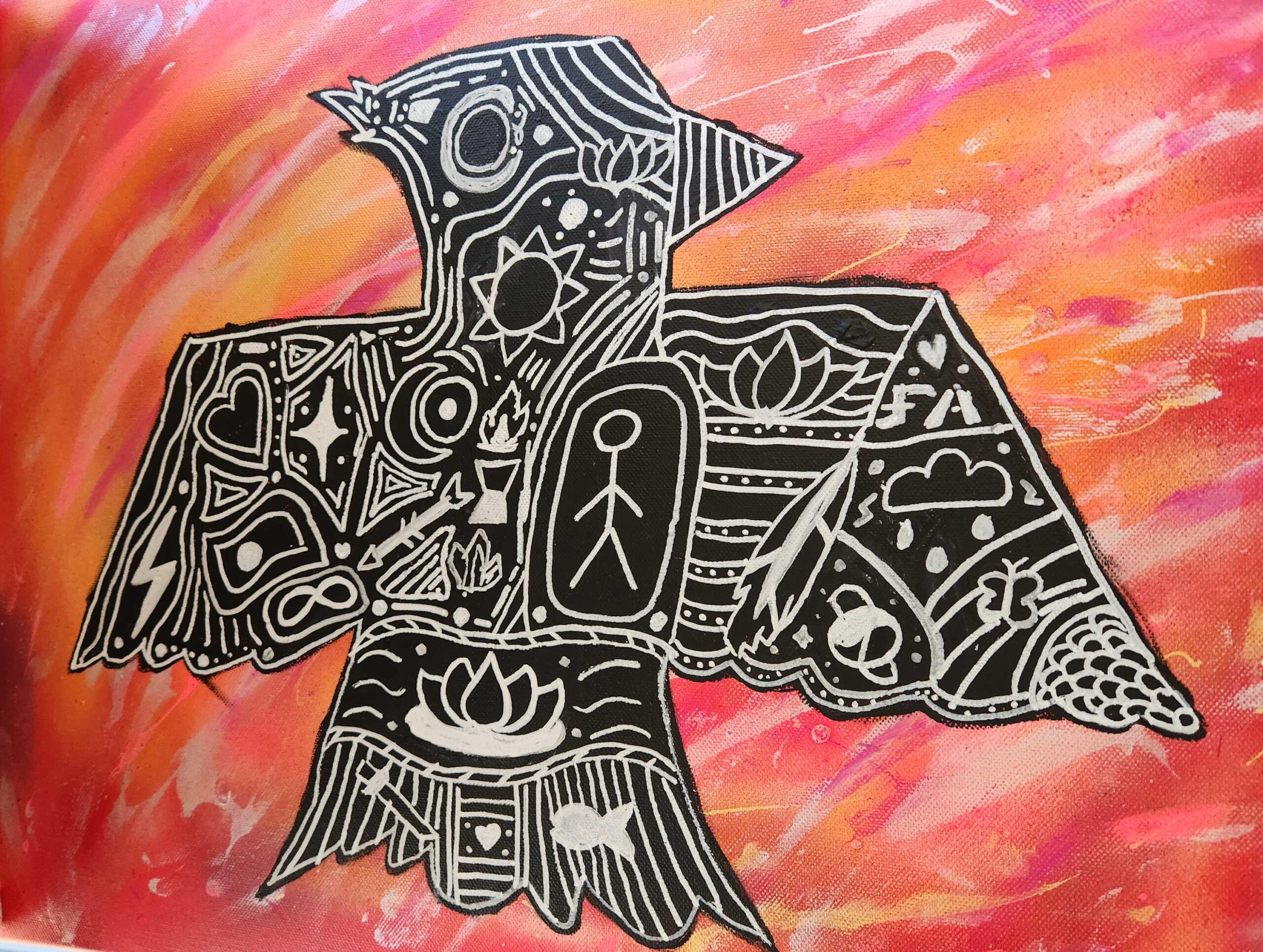 The animal I chose was a crow, I chose a crow because I remember being told Crows hold funerals for the dead and, have huge brains/are very smart. Crows can remember faces and can hold a grudge, they remind me of myself in a way, that’s why i chose a Crow as my animal. I did not put symbols because I didn’t know what represented me. Materials used: 1. Spray paint; 2. Pencils; 3. Canvas; 4. Sharpie markers; 5. White gel pen. Elements of art I used were lines, shapes.