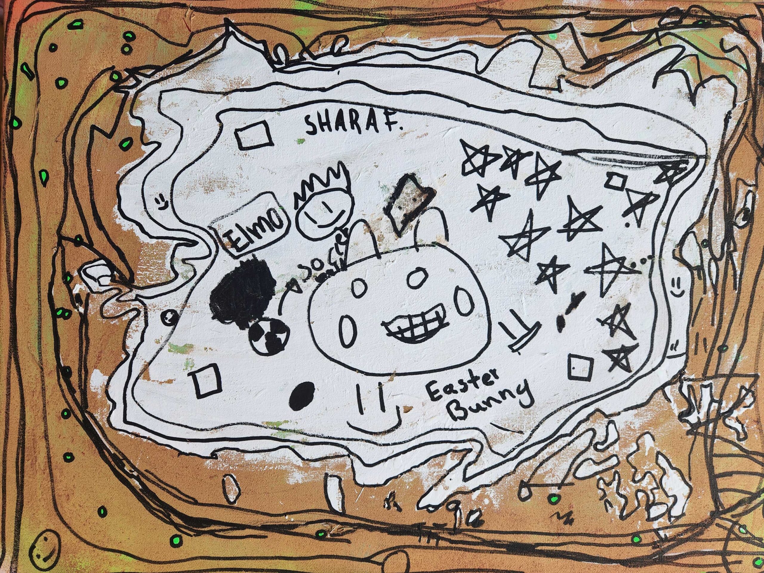The animal I chose to represent me is a rabbit. I chose it because it was the cutest animal there and none of the other options were as pleasing. Some of the symbols I chose that represent me are ghosts, umbrellas, glasses, a hat, the Trinidadian flag and words. I chose ghosts because it was close to Halloween and they looked cute. I chose the flag of Trinidad because my grandmother is from Trinidad. The materials I used to create this art piece were spray paint, paint, pencil and Sharpie paint markers. The elements of art I used in my painting were line, colour and shape.