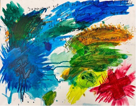 I wish that my viewers that look at my painting will see the story inside my painting and understand why I painted it like that. My intention for people who see my art piece is to understand if they believe hard enough the thing you want will come to you as my wish is that my dog would come out alive and be okay. My story is about how my dog got very sick in the summer and had to have treatment which was 18,000 dollars so we took a loan out of the bank and get her treatment, but we had to start a go fund me to pay back the bank, in the end she came home safe, and we were so glad because we believed it could happen and tried our best to save her! The reason I used those colors is because it looked like throw up when mixed together and when she was sick she wouldn’t eat but throw up alot.