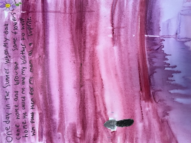 It communicates a memory of my dad getting my mom flowers as a surprise. The intention is it was a very happy moment and it shows to be kind even when it’s not a special day. The story behind it is when my dad did something special for my mom.