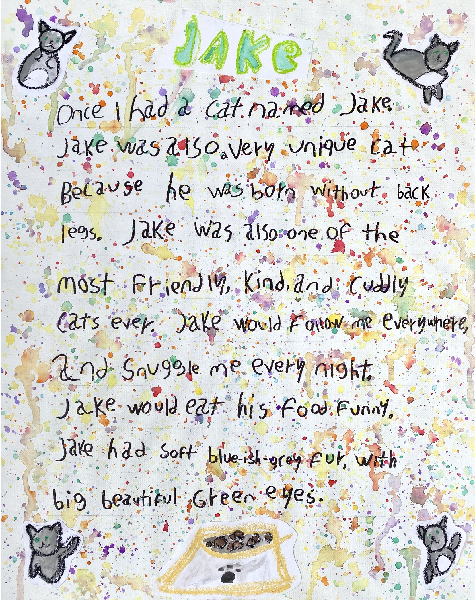 My art piece was created to commemorate the love I had for my cat named Jake. I intended for it to show a memory of love and kindness.