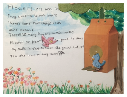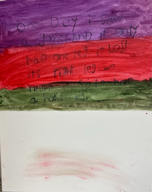 I am a good hockey player because of the shot I made. A guy was trying to body check me so I moved back and he hit the boards and then I shot it and it bounced off the goalies stick into the net. And that’s why I am a good player. Using colours. They are colourful and they make me happy. The drawings of me making the greatest slapshot. The colours and the picture of me.