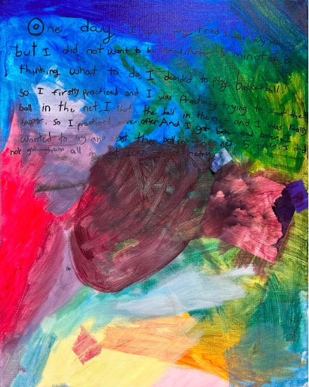 I drew a colourful ocean with a purple rock right in the center of the ocean. And I wrote a basketball story with it. My intention is that I want people to see that my drawings have a lot of colors on it. I want them to feel great and think that I am creative.