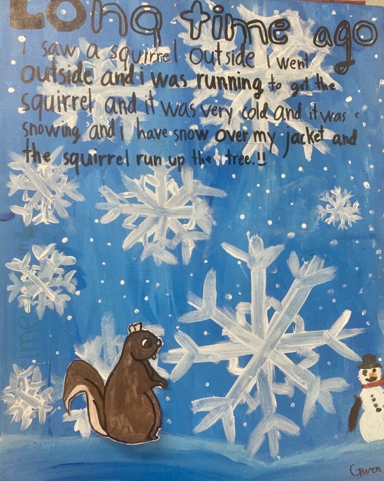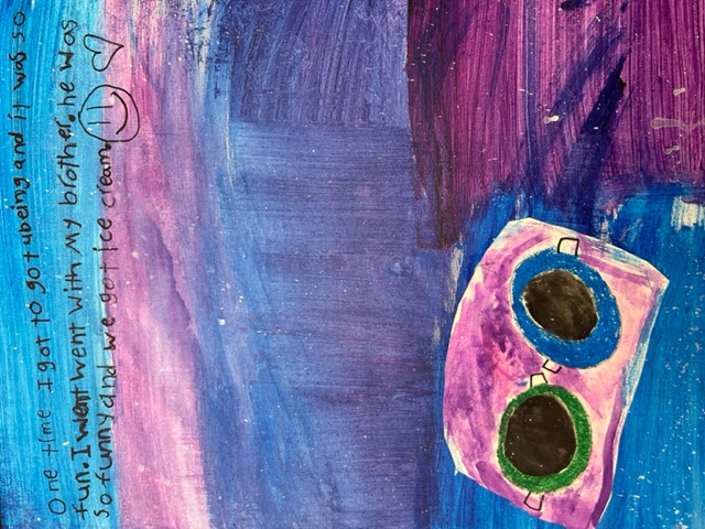 My art piece is about fun things that happen in my life. This is one of the things. This is about when I went tubing with my brother in the winter. I want viewers to see kind, happy, be inspired, a safe place. This memory of mine was so important that I made it into art because I want others to see it and feel the way I did.