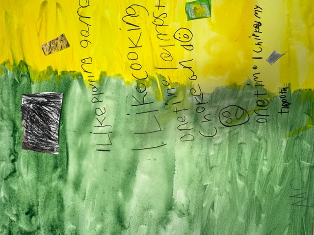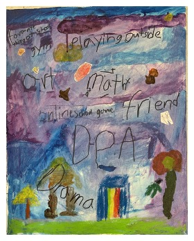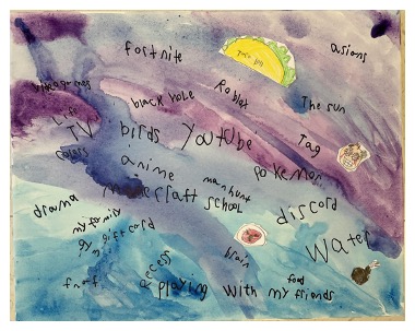 My art statement is about the stuff I like. I like games, friends, and rainbows, family, and nature . I used many colors like blue, green, red and yellow and purple and it makes me feel happy :)