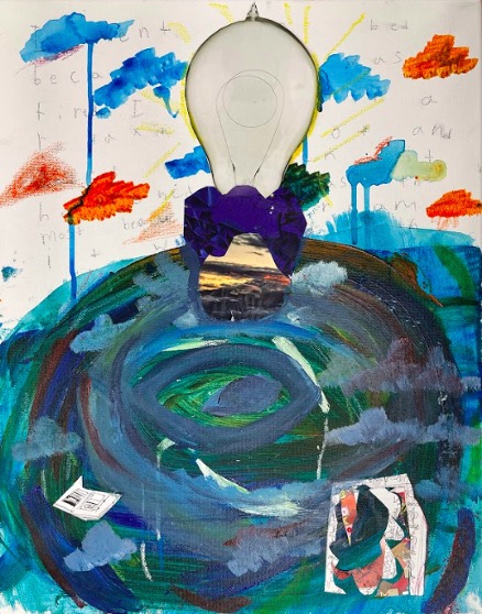 I hope for my viewers to get different ideas on what the painting is or what the painting is supposed to be. Some people thought my painting was a whirlpool or a tornado. You can see an eye in the middle of the art piece. My dream has led to the development of this art piece. It wasn’t what I expected but I still really love it! Lots of colors were used. I didn’t want to use brown in my art piece but it came out really good. I really loved the light bulb in my art piece. It represented thoughts.