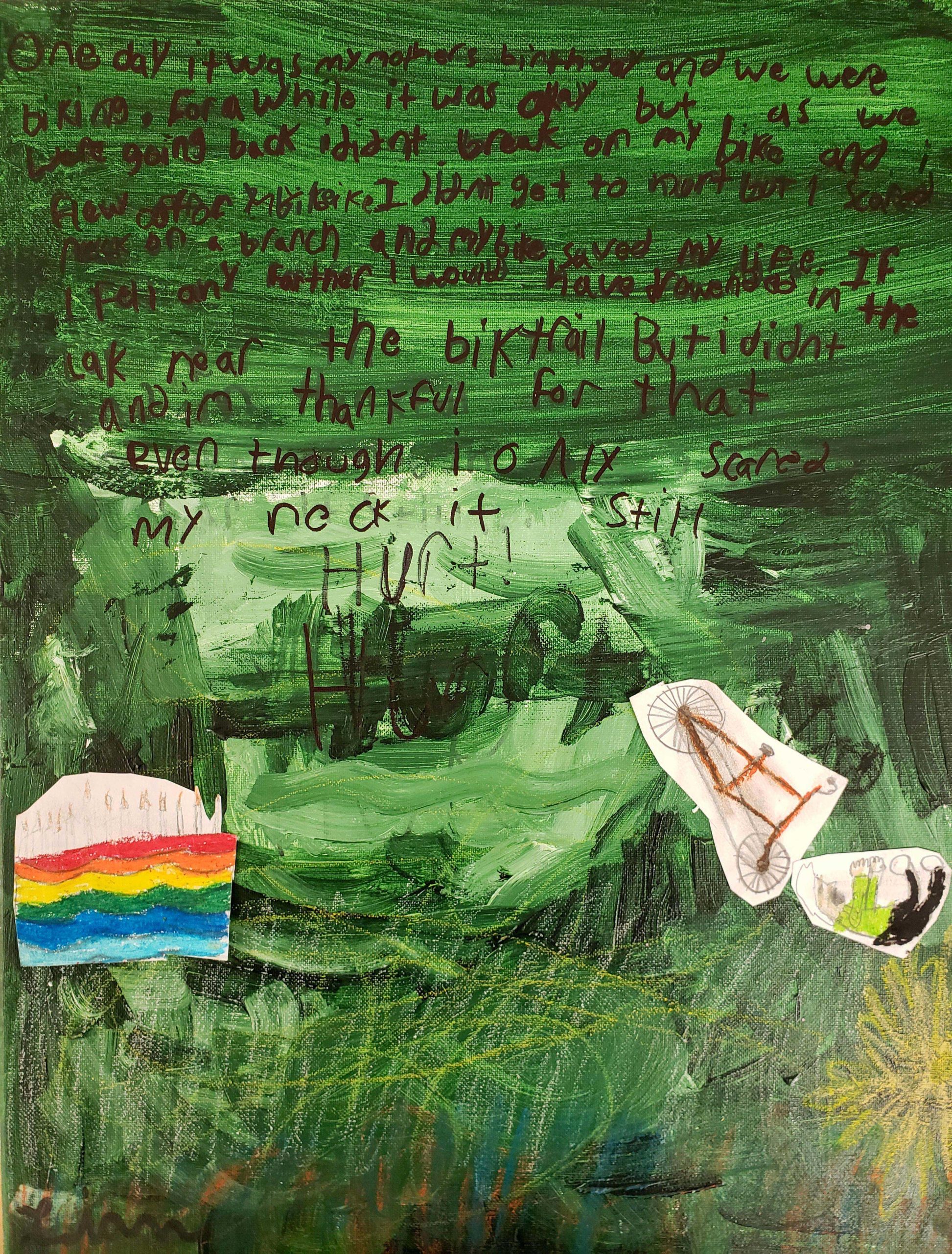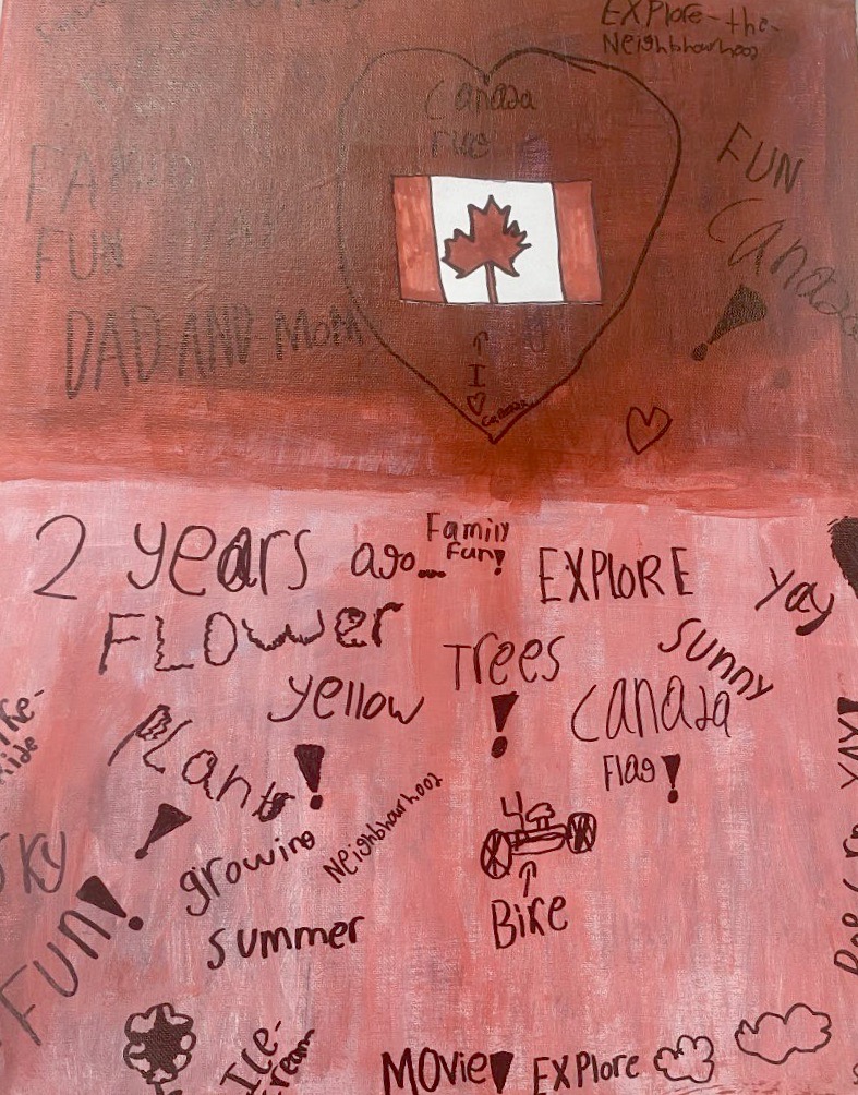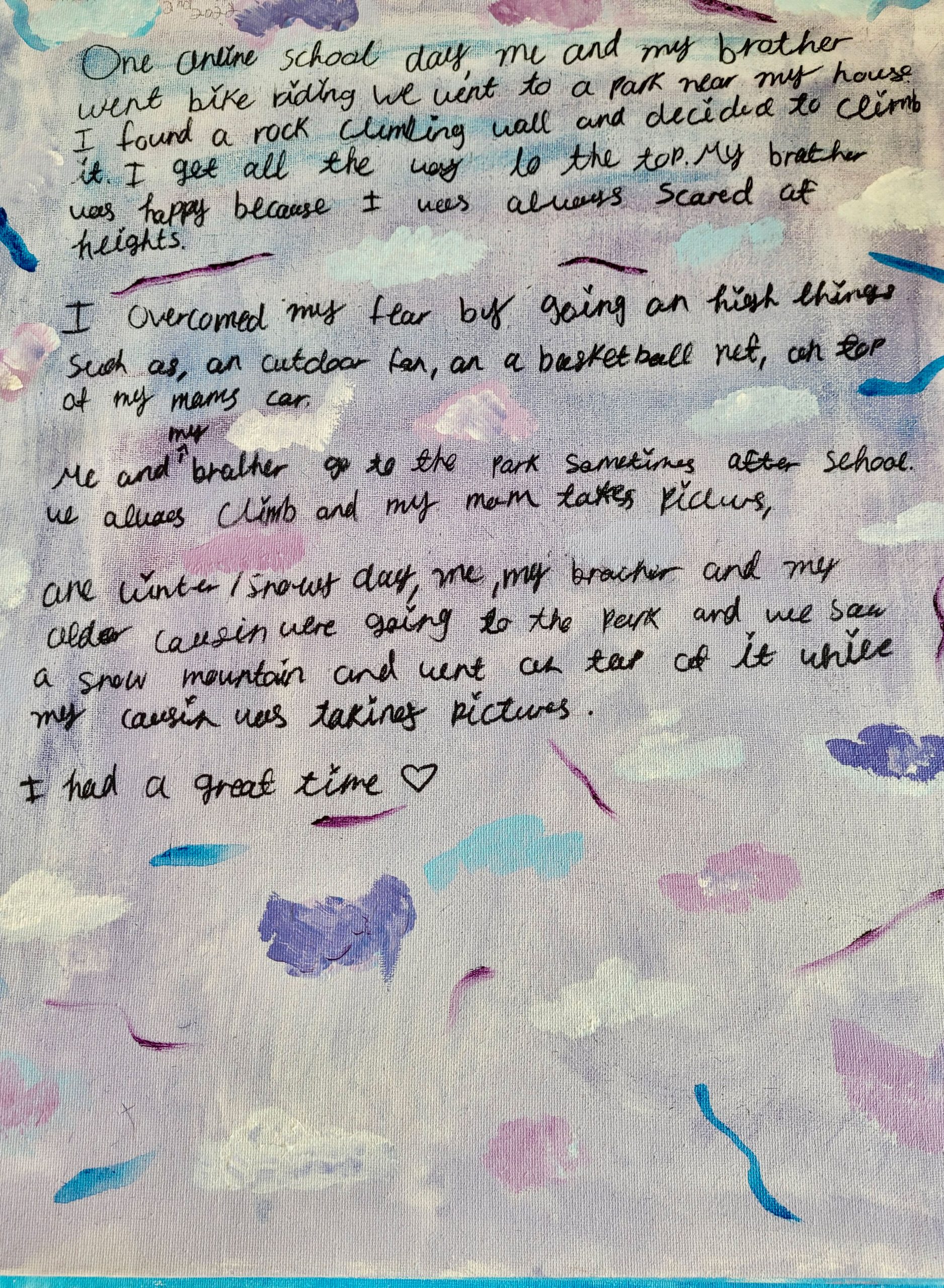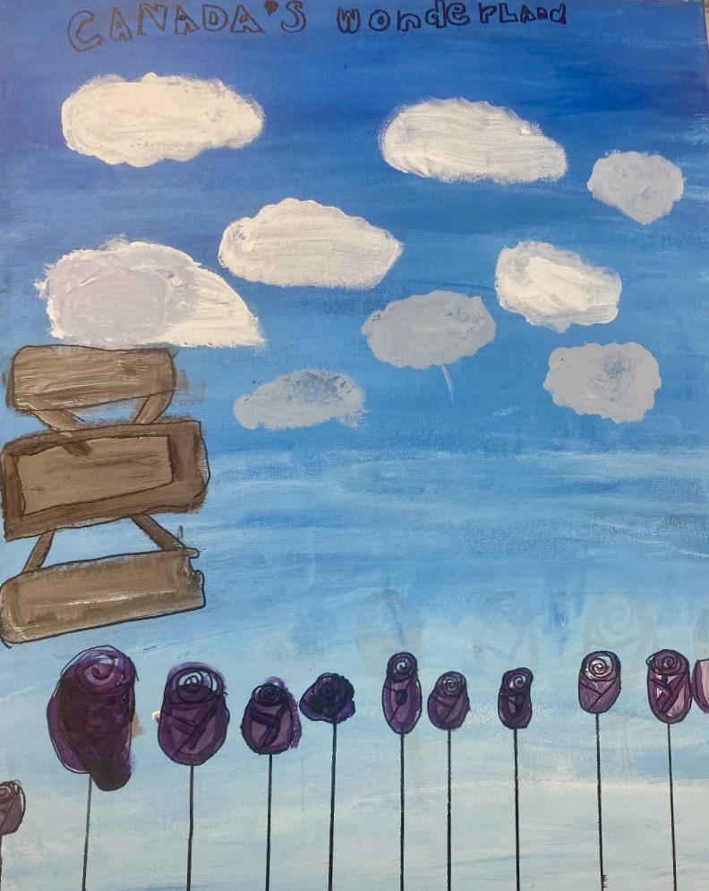 In 2022, the McMichael worked with a total of 236 students from 9 classes at 4 schools across the York Region District School Board. From January – May students met once a week for 5 weeks, working virtually with McMichael Educators, guest artists and Elders.  Participants met for one final 6th session onsite at the McMichael for a day of exploration, viewing the galleries collection and current exhibitions and artmaking together. Artwork created by students during the final two weeks of the program can be seen below. This project encouraged students to reflect and visually represent an important personal experience in their lives, some of the students have included an artist statement along with their painting.