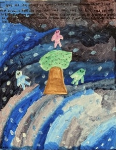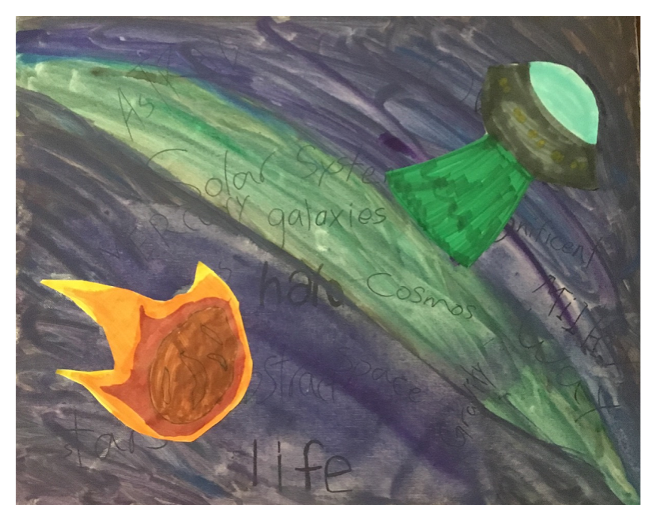 This is a art piece is called Life in The Galaxy because, when I look at it I can see living creatures and a tree in the middle of the different colour aliens. This is a art piece of 3 aliens that are friends with each other and they discovered a floating apple tree in the galaxy. This art piece is important to me because this makes me want to visit an astronomy museum which actually looks really fun.