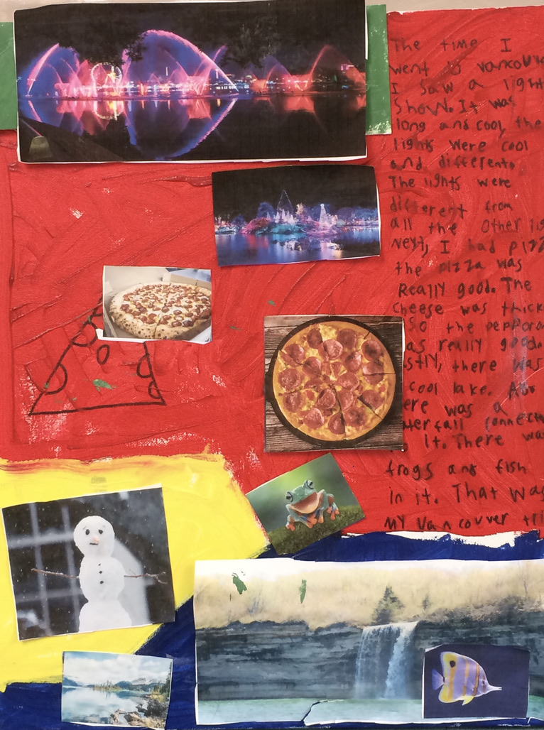 The message my art communicates is that happiness that comes from the fun things that you can do in Vancouver. You can eat amazing food, where some of the best tasting pizza can be found. The waterfall is a beautiful place where you can see many amazing animals like different fish and frogs. There is also a huge light show that you can go see as well. The story my art tells is that Vancouver is a nice and calm place that I went to during the winter break. The intention I want people to have when they see my art is that you should visit Vancouver.