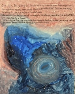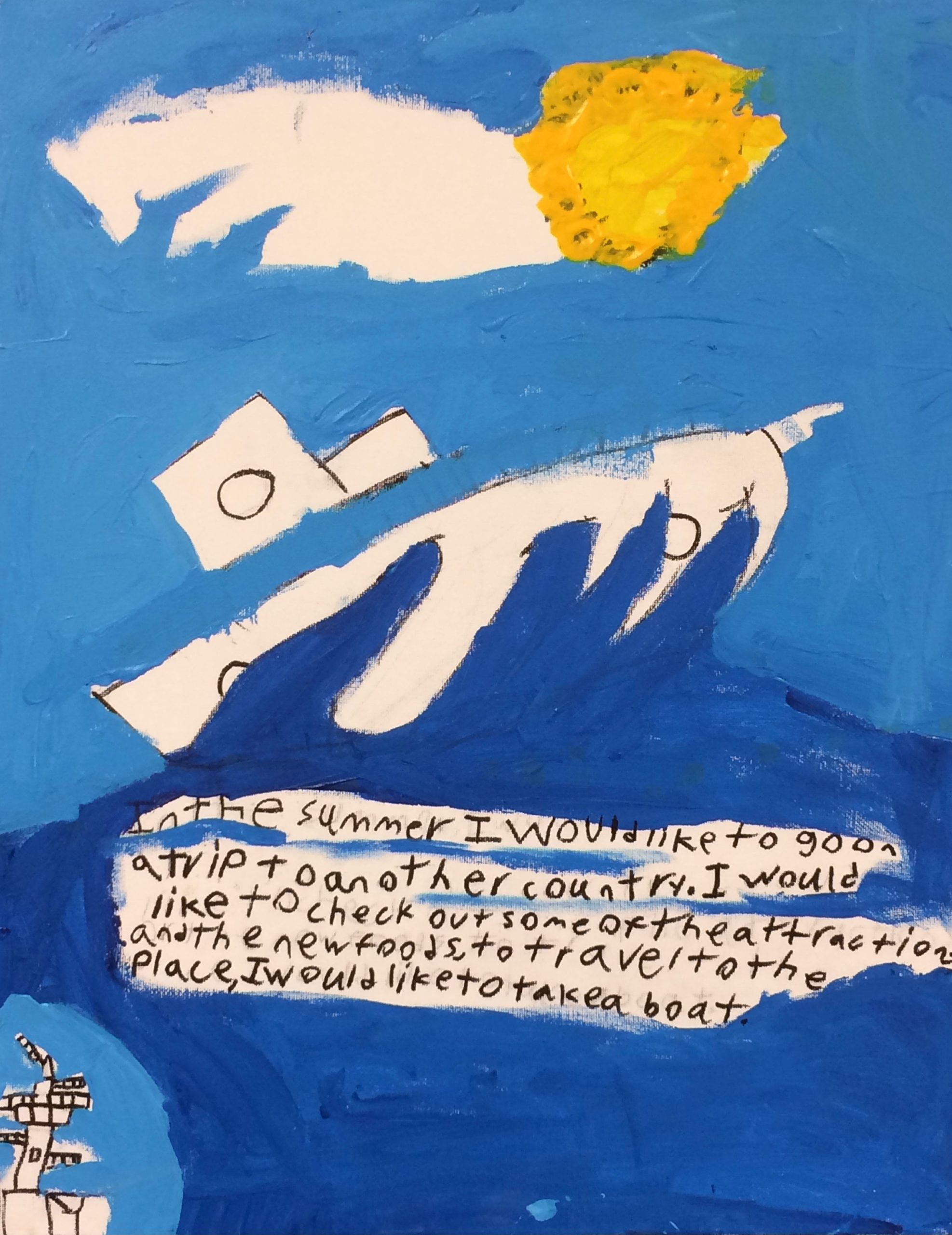 This painting is about how I would like to go to a different country. I’ve only been to Canada and China and I want to make that list bigger. When people see this painting I want them to have a sense of adventure and maybe feel the waves as the boat rides around. It’s a shame that I haven’t finished this.