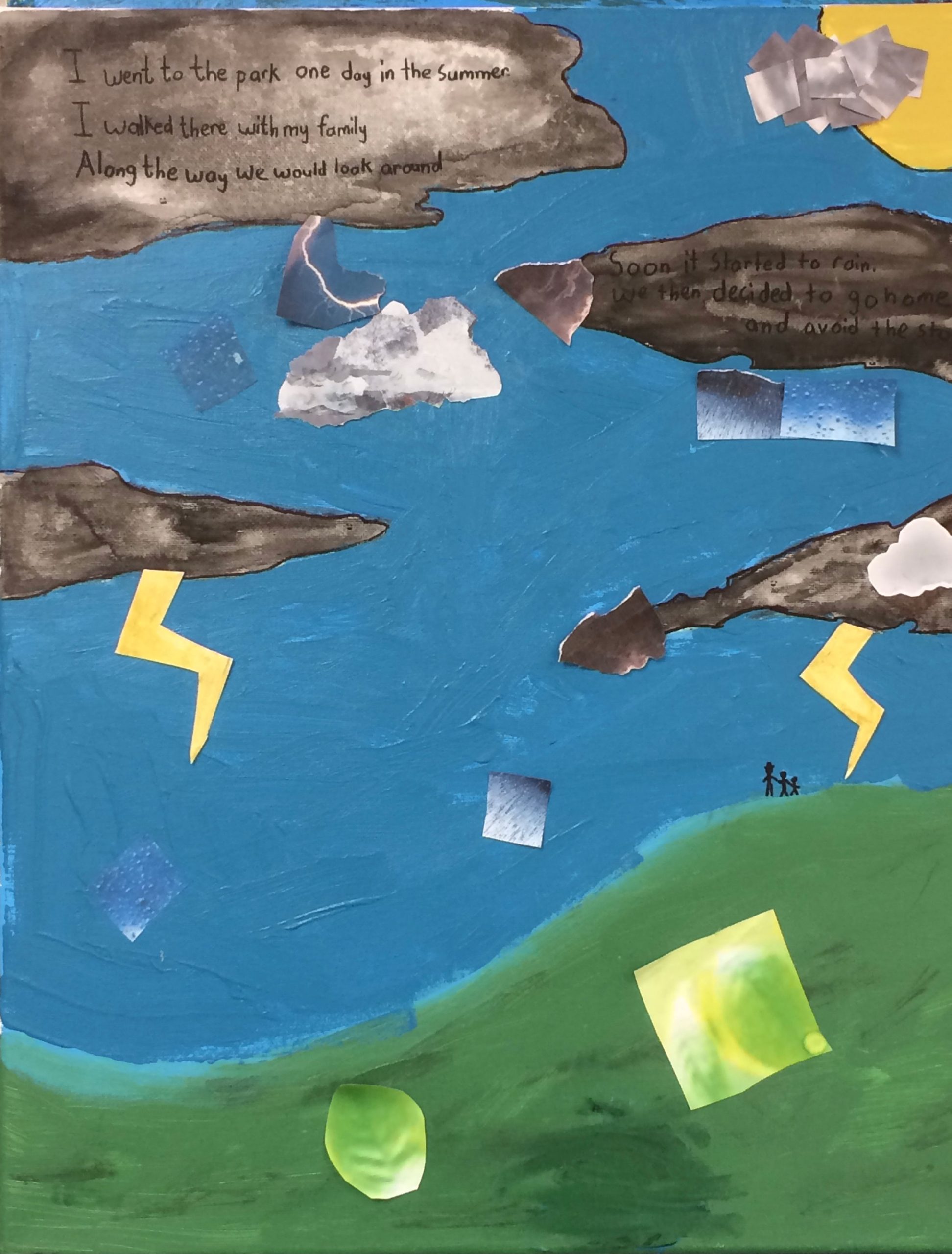 The art tells people to check weather reports before going outside because you might get wet if you don’t. My grandma, brother and I went to the park and it started raining so we went home to avoid the storm. I want viewers to feel happy because I helped them have a lower chance of getting wet.