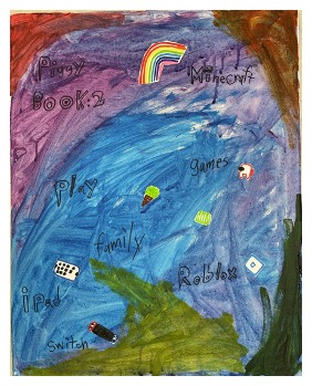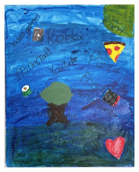 My art piece communicates that I like to eat food and I like to play video games a lot. My intention for the viewers who see my art is so people will know what games I like and what foods l like. My intention for the viewers who see my art is so that the viewers tell people about my art and those people will see my art too. My art piece is about my favourite video games such as roblox and minecraft and my favourite foods such as sushi and pizza.