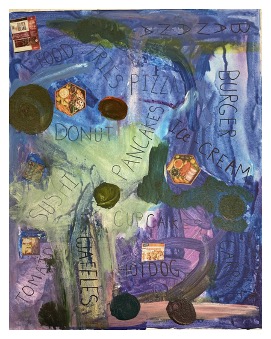 My art piece communicates some of my favourite food. My intention for my art piece is to show that everybody likes different things. For example, I like sushi. The story that led me to the development of this piece is food. I like to eat food. People have cultural foods during cultural holidays. For Example: During cultural holidays I like to eat food that represents my family, me and my culture. My family doesn’t eat meat on cultural holidays. I used different colours in different shades to represent my favourite foods.