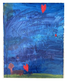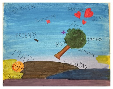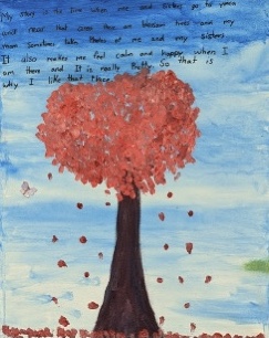 My piece is a windy day on the hills. I got inspired by a time when my family and I went outside and a tree fell down because it was very windy so that’s why I painted a tilted tree and the three hearts represent my family. Something that means a lot to me in my art piece are the math equations because I love math. I also added a basketball which represents sports because I like to be energetic. I also added different colours in the hills because I like to make my drawings realistic, cartoon or both!