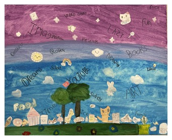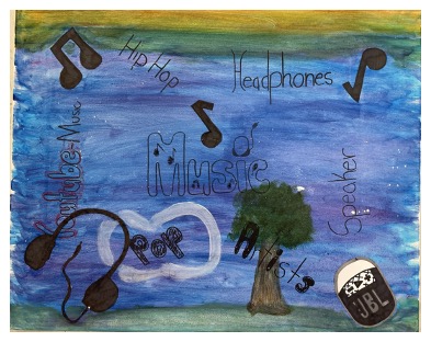 My artwork communicates with the art of music. Music helps me understand my feelings and attitudes. Music makes me feel all the kind and positive words and feelings about myself. When viewers see this art piece of music, I want them to understand that music makes me feel welcomed and the positive things about me. The trees and beautiful sky in my artwork that’s in this art piece, helps me see the nature of music, as I love to see the nature and beauty of music. The story of my art let’s me know me and what message I bring to myself!