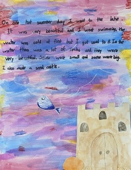 This painting shows what happened during my trip to a lake. It recounts my incident where I tripped and fell into the lake.