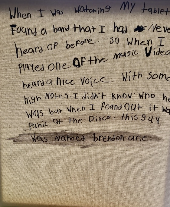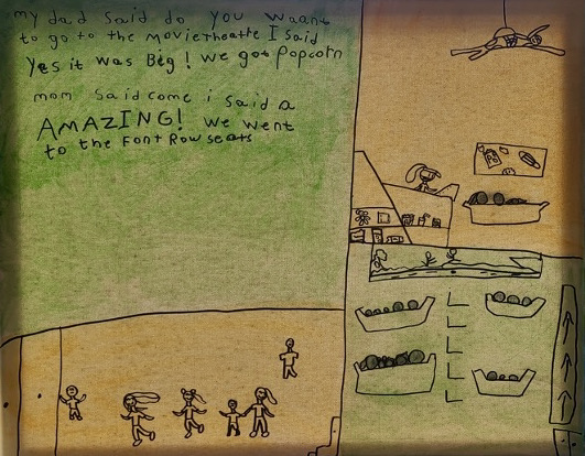 It represents my first time at a movie theatre. It also represents how I was feeling at the movie theatres. I felt happy and a little shy. I am proud that it didn’t cover the whole entire words when I have it to paint over it. It has words of how it made me feel and also it explains what I did at the movie Theatres the Focal Point. I would say that it is not drawing over the lines.