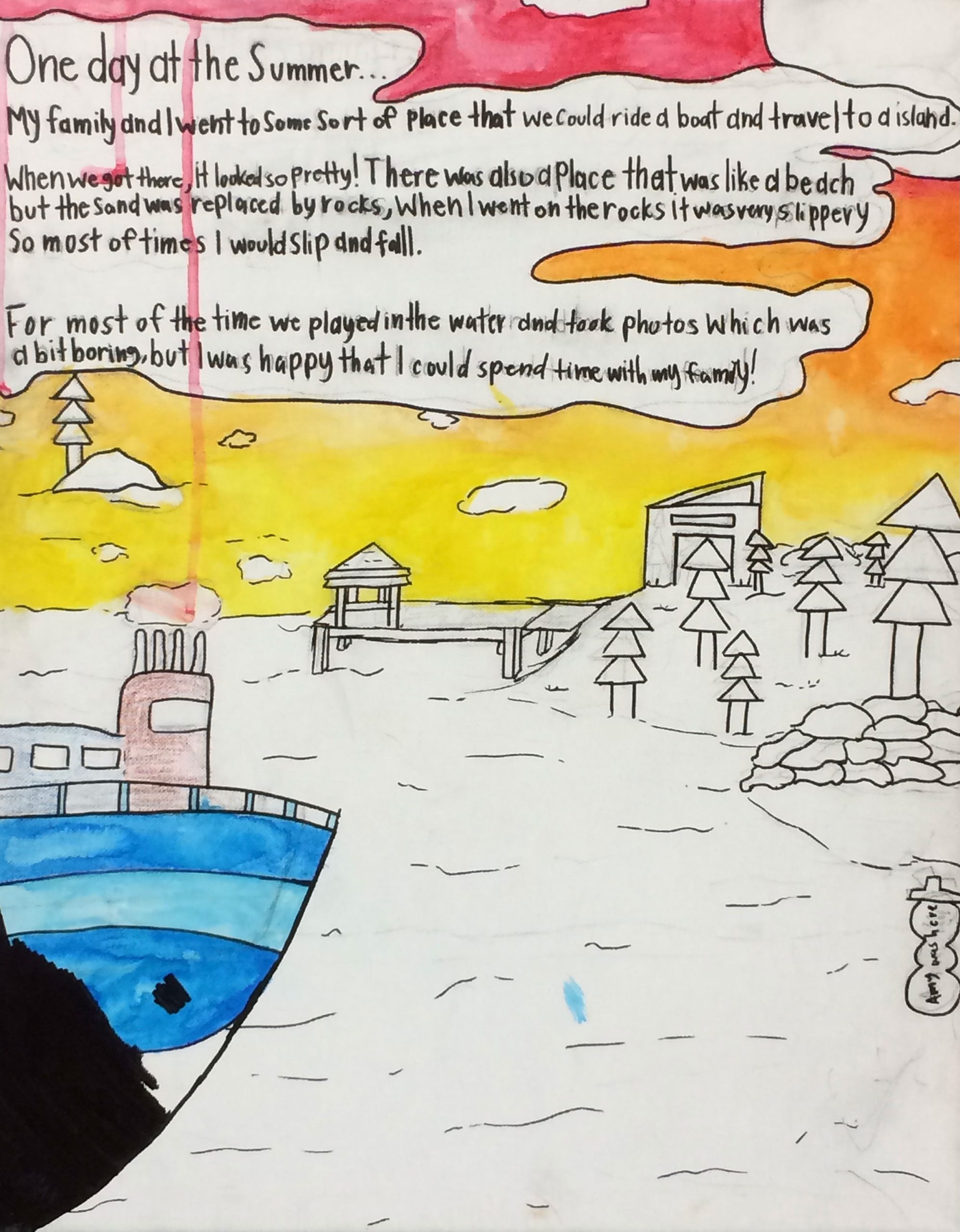 My artwork is about my family and I going on a beautiful island and spending time with each other. I want people who see my painting to feel calm and relaxed from the sunset in the background.