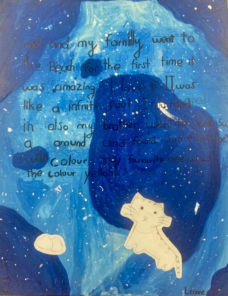 My artwork is about the beach. The beach was beautiful. When you go to the beach, it makes you feel relaxed.