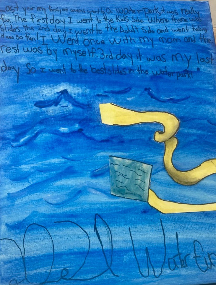 It’s a painting of a waterpark. I chose the waterpark because I love the color and it’s so natural and pretty. For the viewers I want them to go there and have some fun and happiness. I went to the water park before and I saw so many slides and THE POOL WAS SO CLEAR AND WARM I LOVED IT. I almost went on all the slides before they closed the water park down. That’s why I chose this subject.