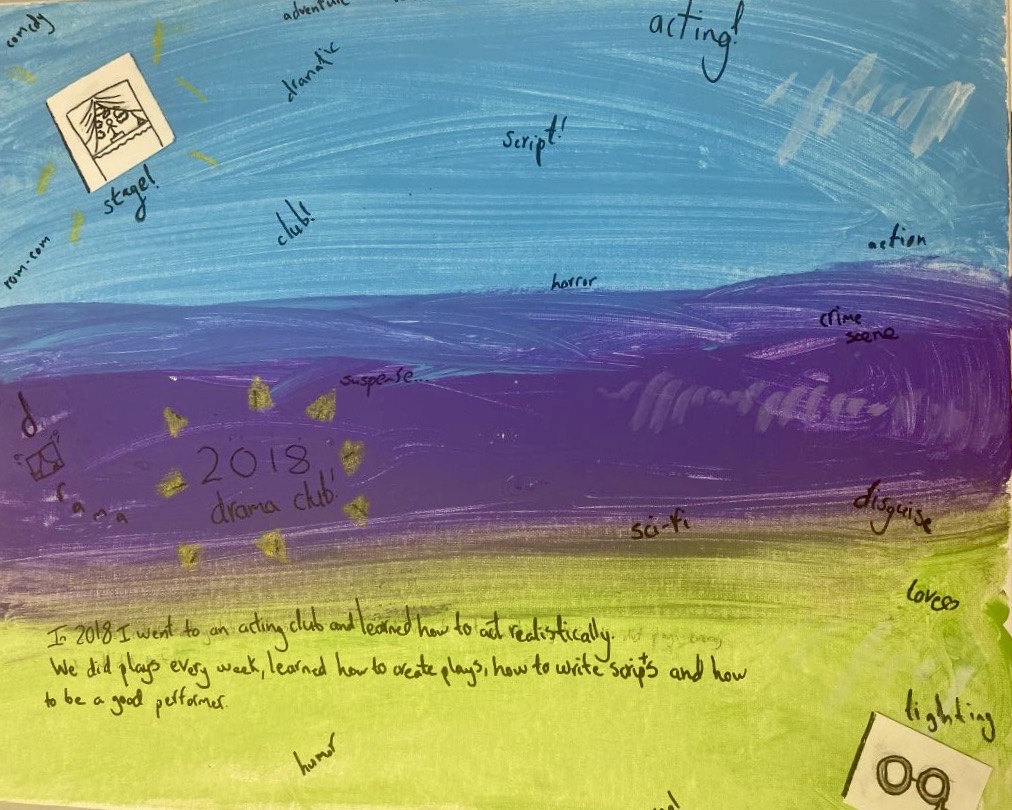 Artist statement is about the drama club I went to in 2018. My intention for viewers who see this piece is to learn about the drama club truarc. The story that I used is very detailed and yet very subtle, I went to a drama club when I was seven and learned about the different elements of drama.