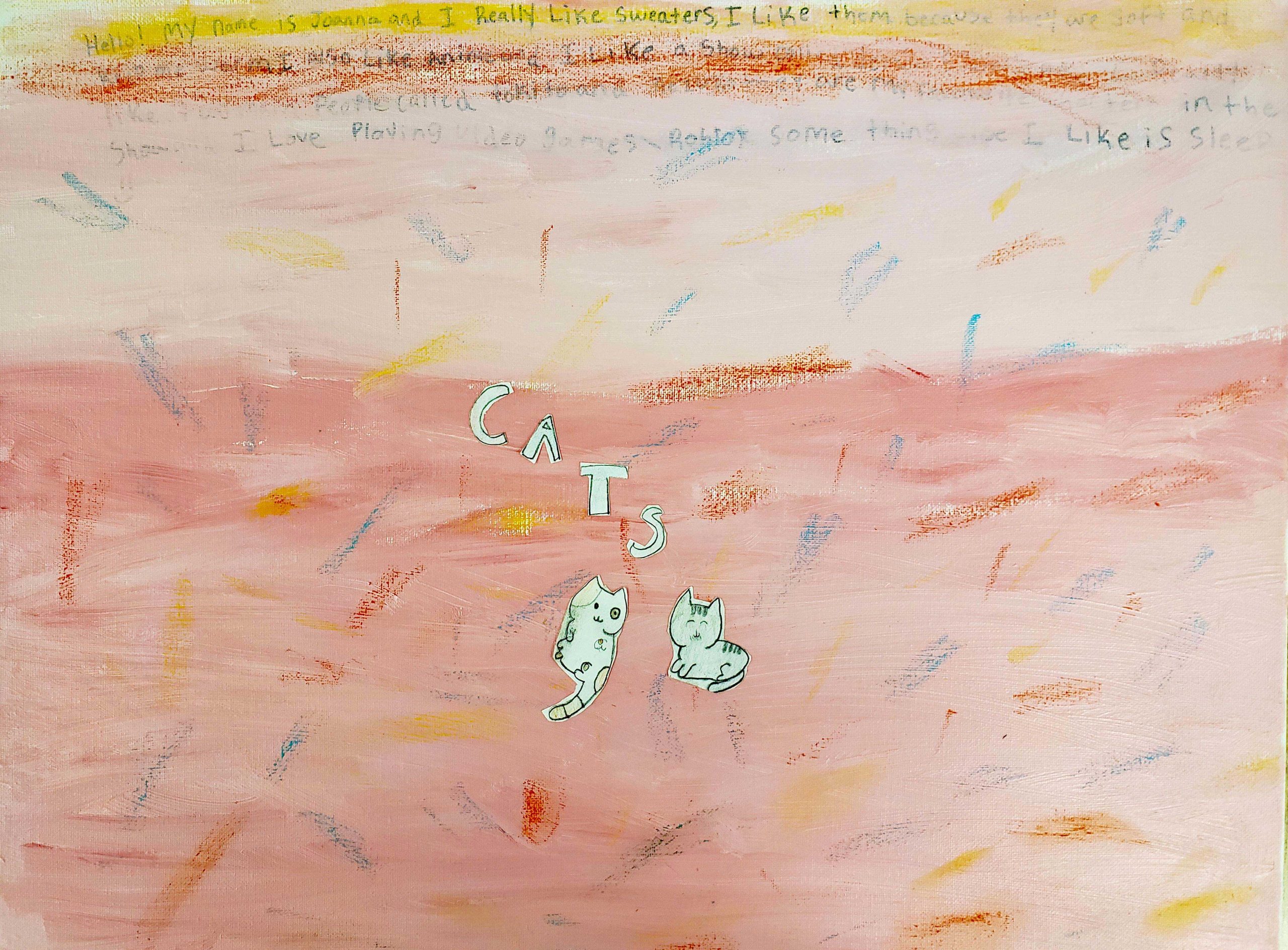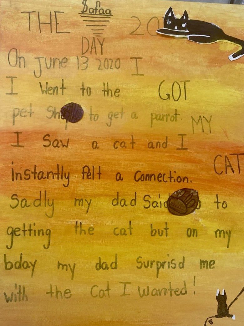 This artwork is about the day i got my cat. I was super happy when I got to keep it because I always wanted A fluffy animal as a pet so now you know why. I hope when you see my painting, you will feel really happy and warm inside when you feel sad.