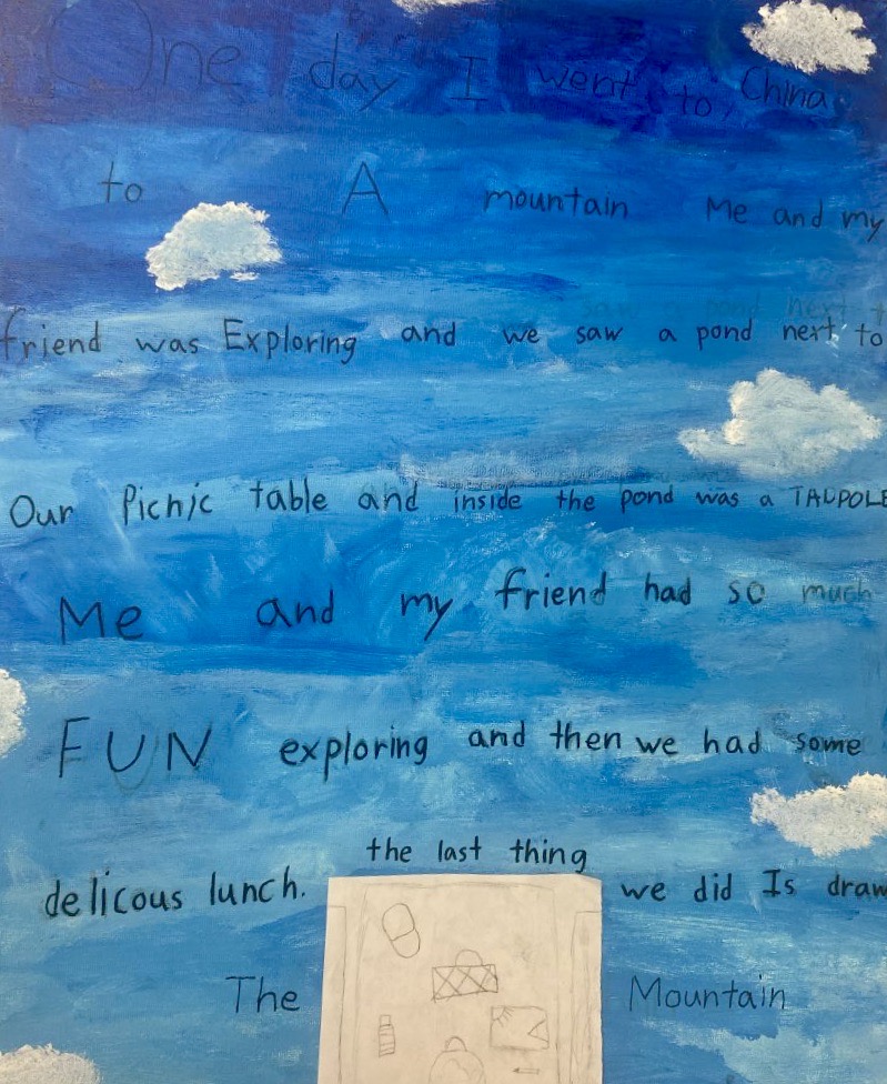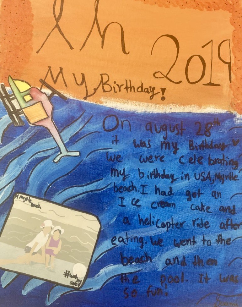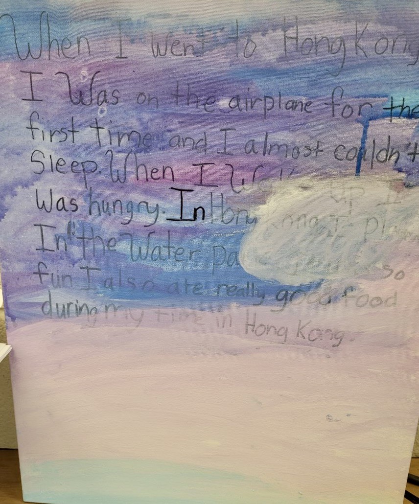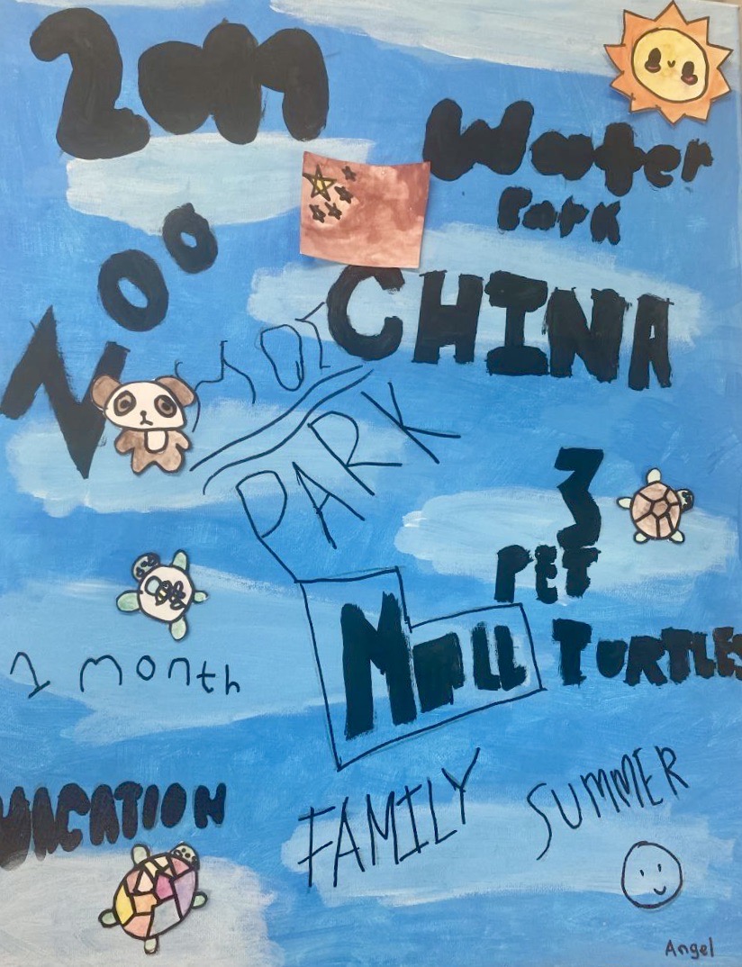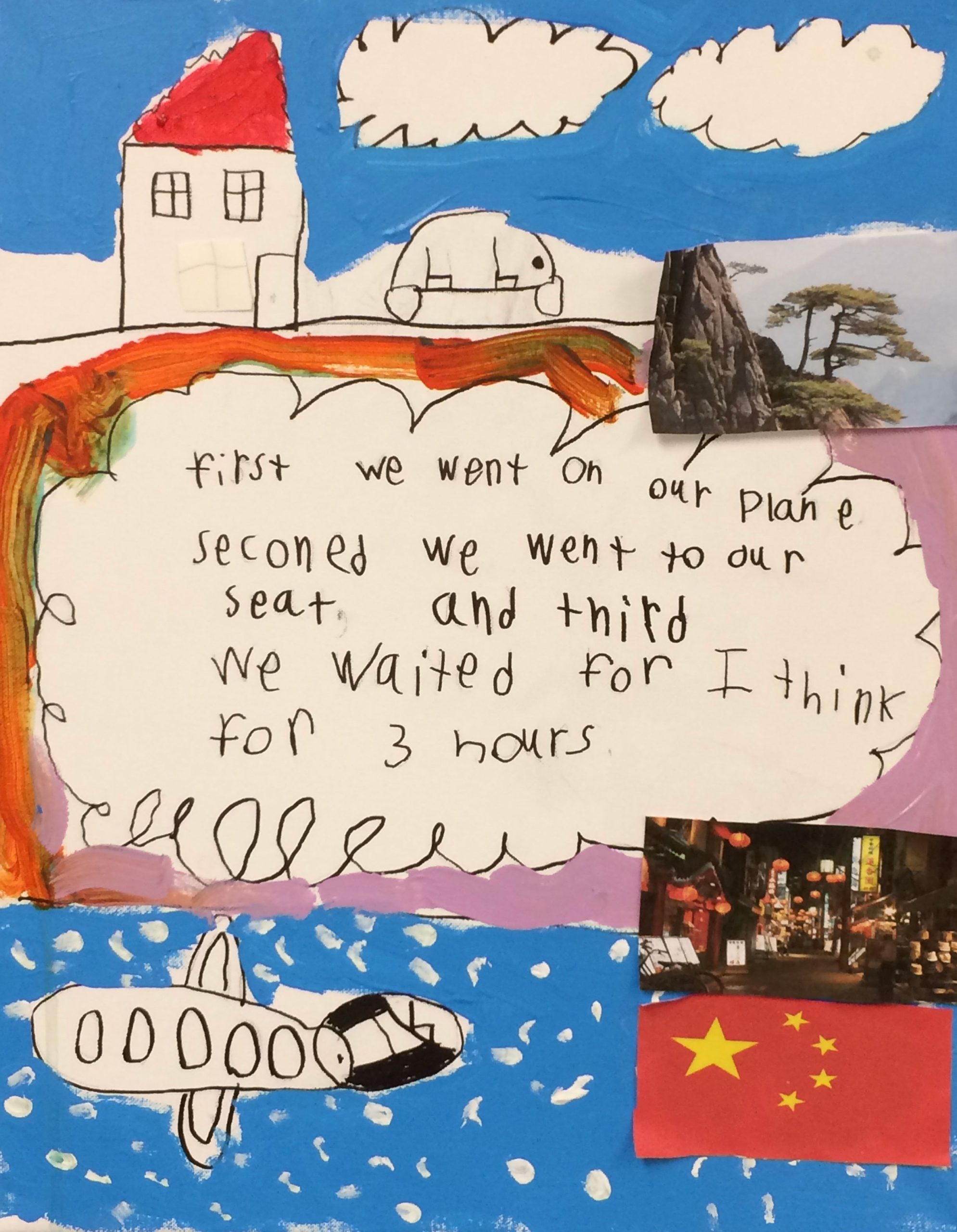 My painting is about going to China for my grandpa’s birthday. I want people who see my art to think they should go to China because it is fun there.