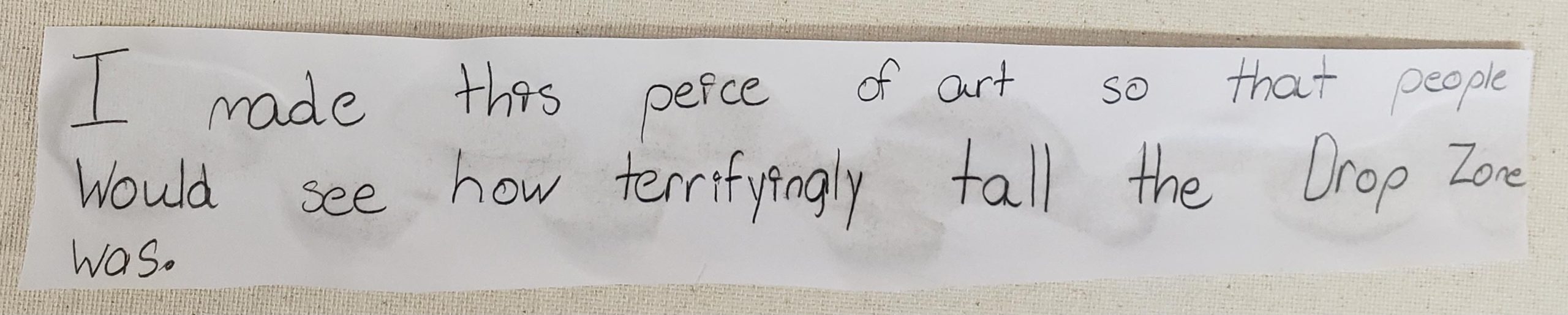 This art is a memory that I had at Wonderland. I chose this memory because it often pops up in my head everyday. I also chose this because Wonderland is one of my favourite places to go during the Spring and Summer. My intention when people see this is that they shouldn’t be scared to go on high tides like the Yukon Striker or Leviathan. They should just go on them and have fun.