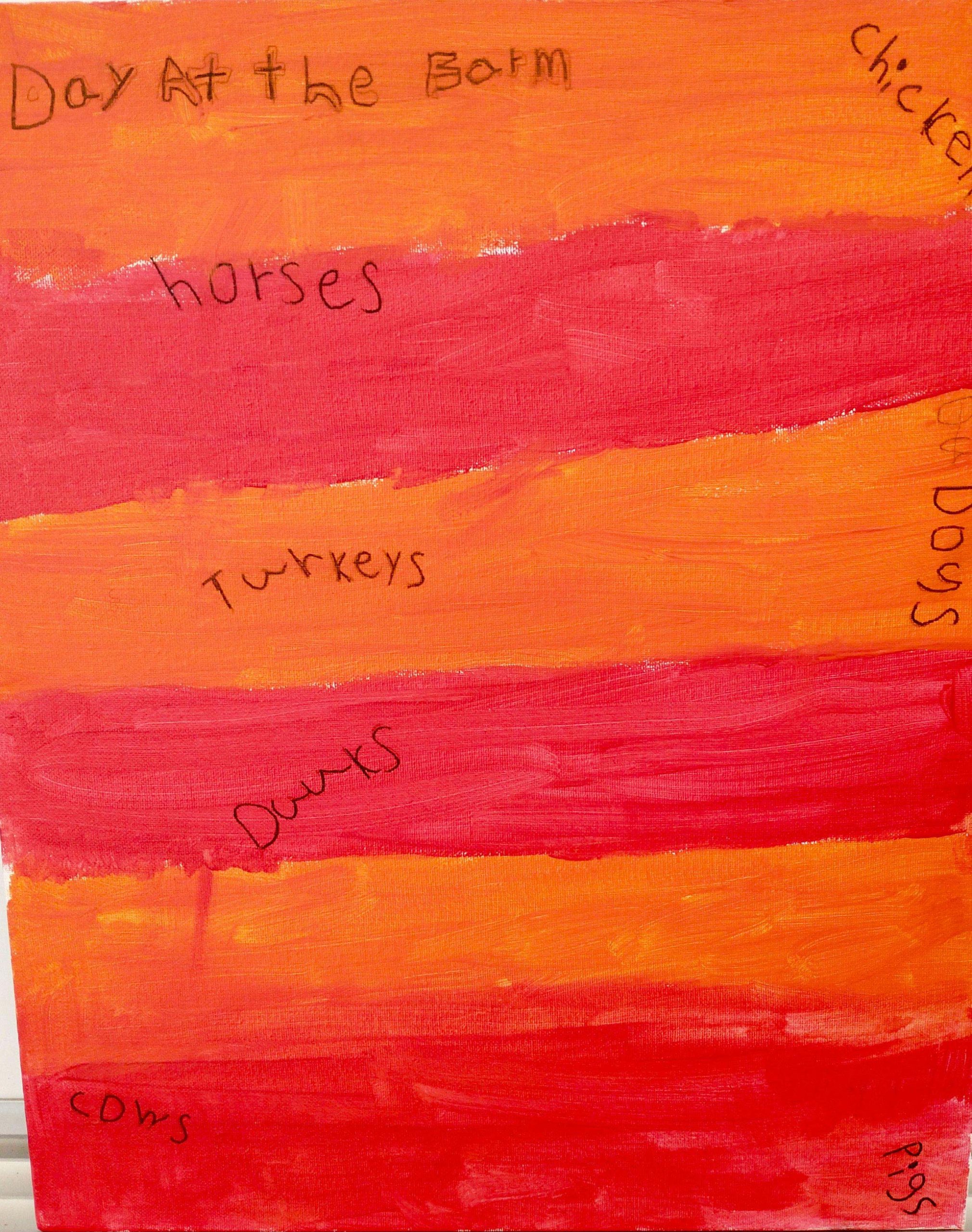 I was inspired by my nana’s farm. The farm is orange and red. She has many animals there. I went there with my aunt.