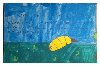 Once me and my family went on vacation. We went to the beach and went in the water and I saw a shark. It scared me so I told my dad who told the lifeguard then the lifeguard said that to everyone.