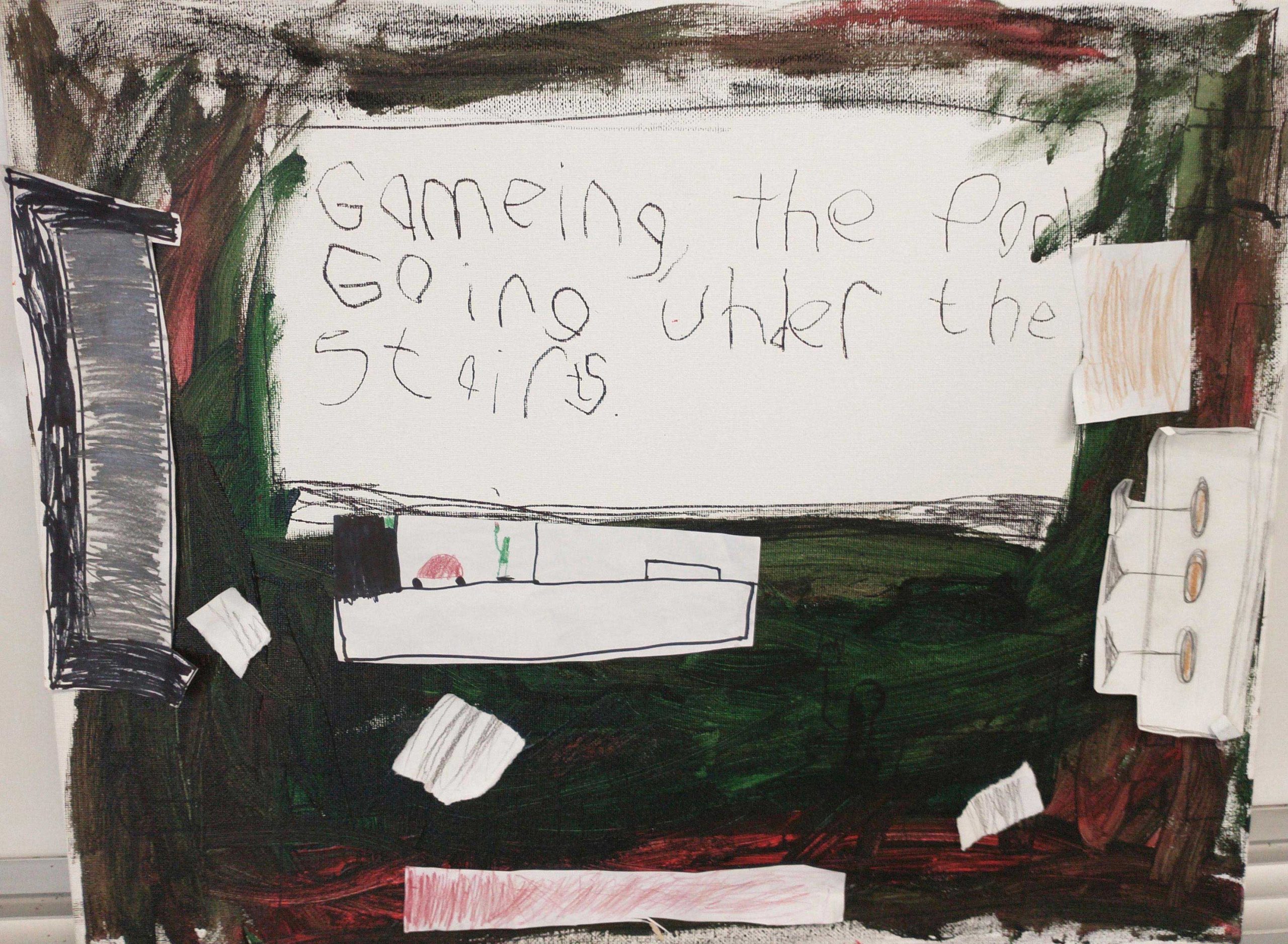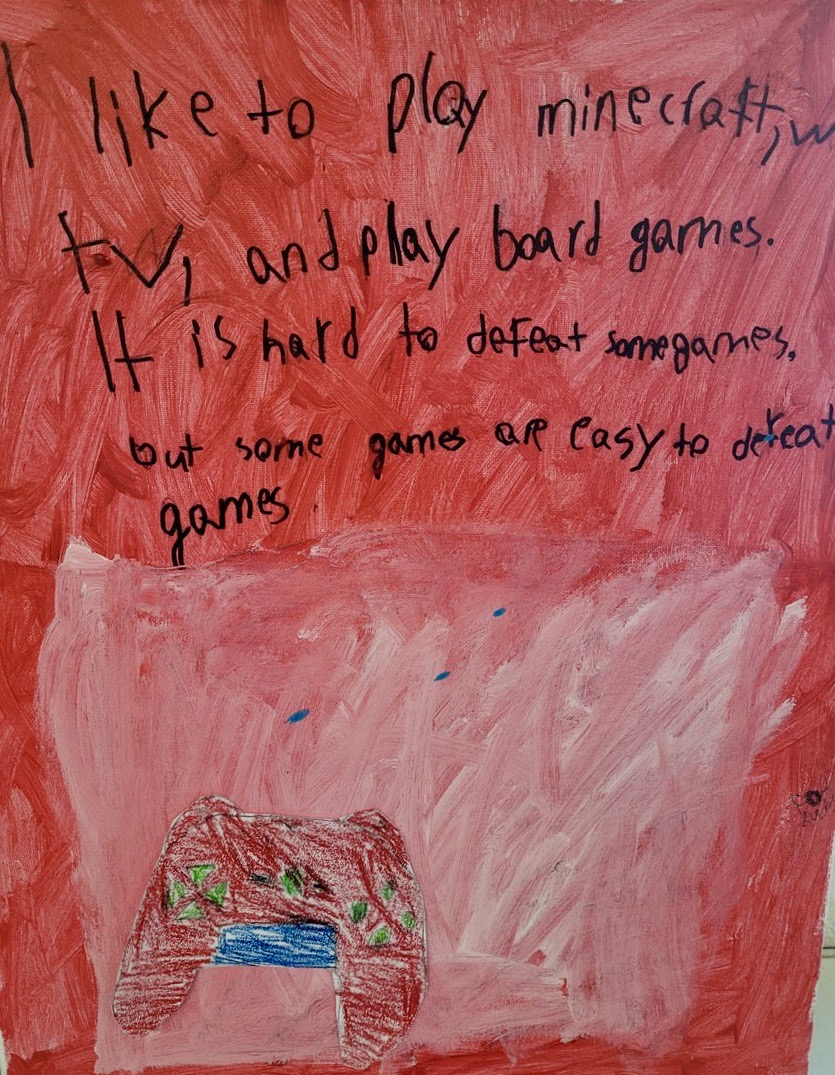 My art is about myself. What I like and what I do in my free time the viewer will see. They can think about what they do in their free time and what they like about themselves. I like when I watch Youtube and read books to calm my mind and to play video games with my friends and classmates.The best thing is that we did it with McMichael gallery. We had 2 lessons to finish. It was lots of fun to do it.