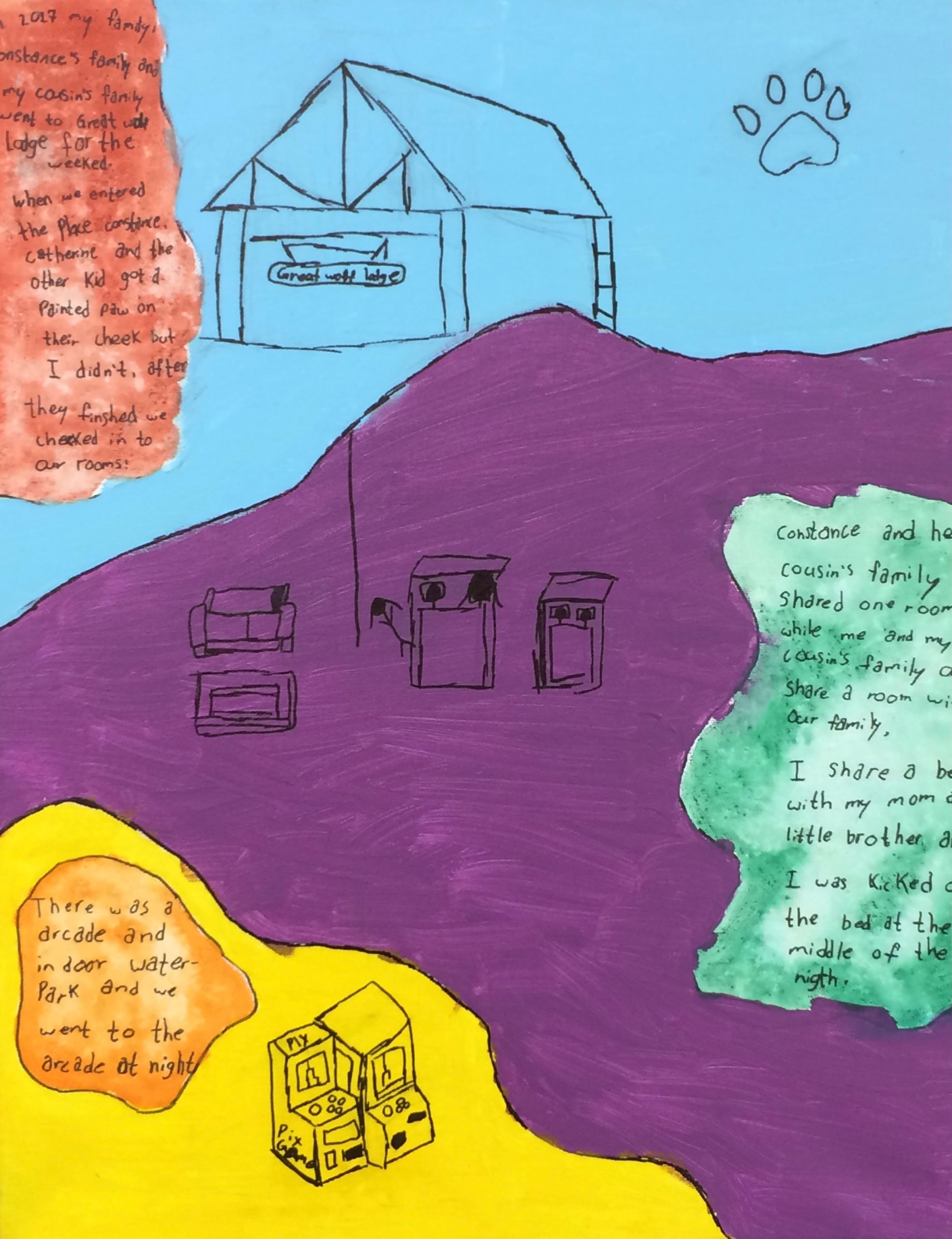 The art tells people to go to Great Wolf Lodge and tries to show people that this is a fun place to go to. I went to the Great Wolf Lodge with my friend Constance, my cousins, and my family. We went to the indoor waterpark and we also went to the arcade at night before going to bed. I had to share a bed with my mom and little brother. Sometimes in the middle of the night, I would get kicked out of bed. I want people to think that Great Wolf Lodge is a fun place to go to. I want them to feel happy because I recommended a new place they can go to.