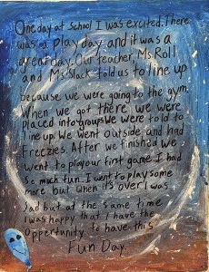 My art is about me and it is my favorite things in school which could be gym and it could be art or DPA. I want my viewer to know about me like what my favorite thing in school is and so the viewer knows about the art. I will say the story is about me. My first favorite thing in school is Gym and second is Art and my third is DPA and that is my favourite things in school.