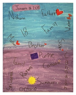 My art communicates that you should be proud of who you are and not hide or be ashamed of your identity. I wanted my viewers to see that my art was telling a story about me and to inspire you to not be afraid of people judging you based on your identity. The theme of this art was me. I wrote words that are important to me and my favorite things like my family, my nationality, my favorite colour which is purple and many other things that are important to me.